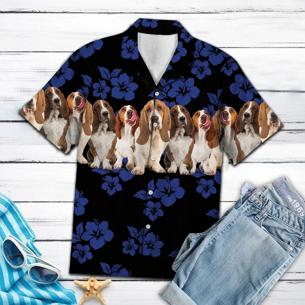 Hibiscus Trópaiceach Cú Basset Iontach ar Léine Haváí le Patrún Dubh, Bronntanas Léine Haváíais, Bronntanas Nollag