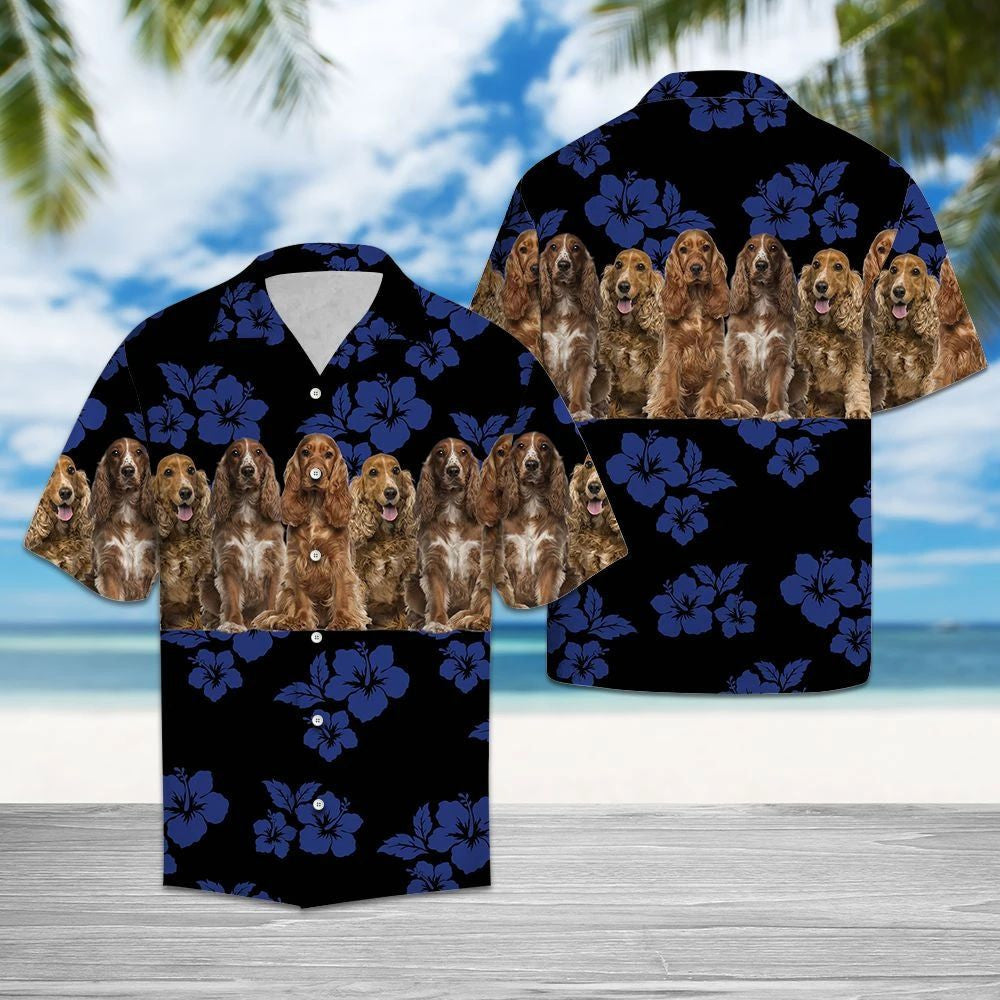 Hibiscus Trópaiceach Cocker Uafásach Spaniel Ar Léine Haváí le Patrún Dubh, Bronntanas Léine Haváíais, Bronntanas Nollag
