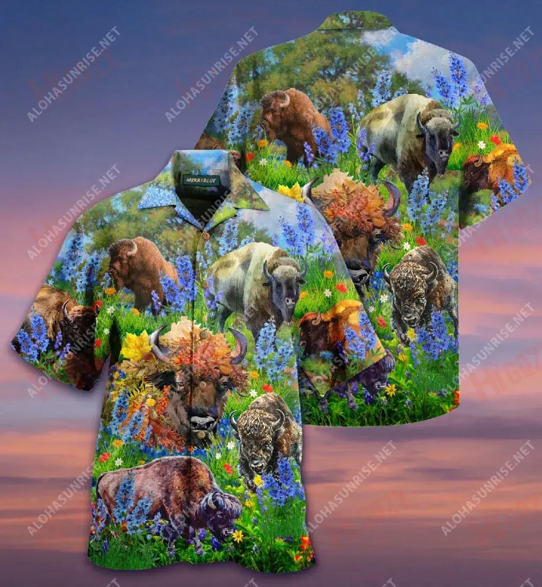 Léine Muinchille Gearr Bison In Spring Field Laethanta Saoire Muinchille Ghearr Léine Oirbheartaíochta haváíais Léinte haváíais do Mhná, Bronntanas Léine Haváí, Bronntanas Nollag
