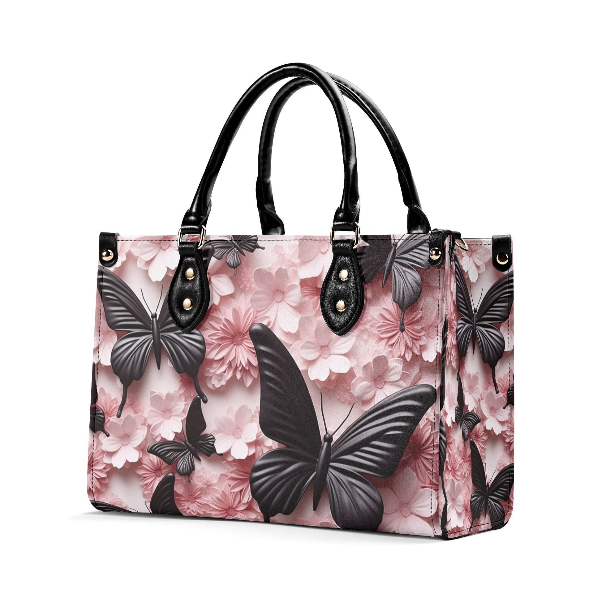 Black Butterfly Chic Tote Handbag. Pink Handbag, Waterproof PU Leather Tote, Top Handle Vegan Leather, Crossbody, Shoulder bag.