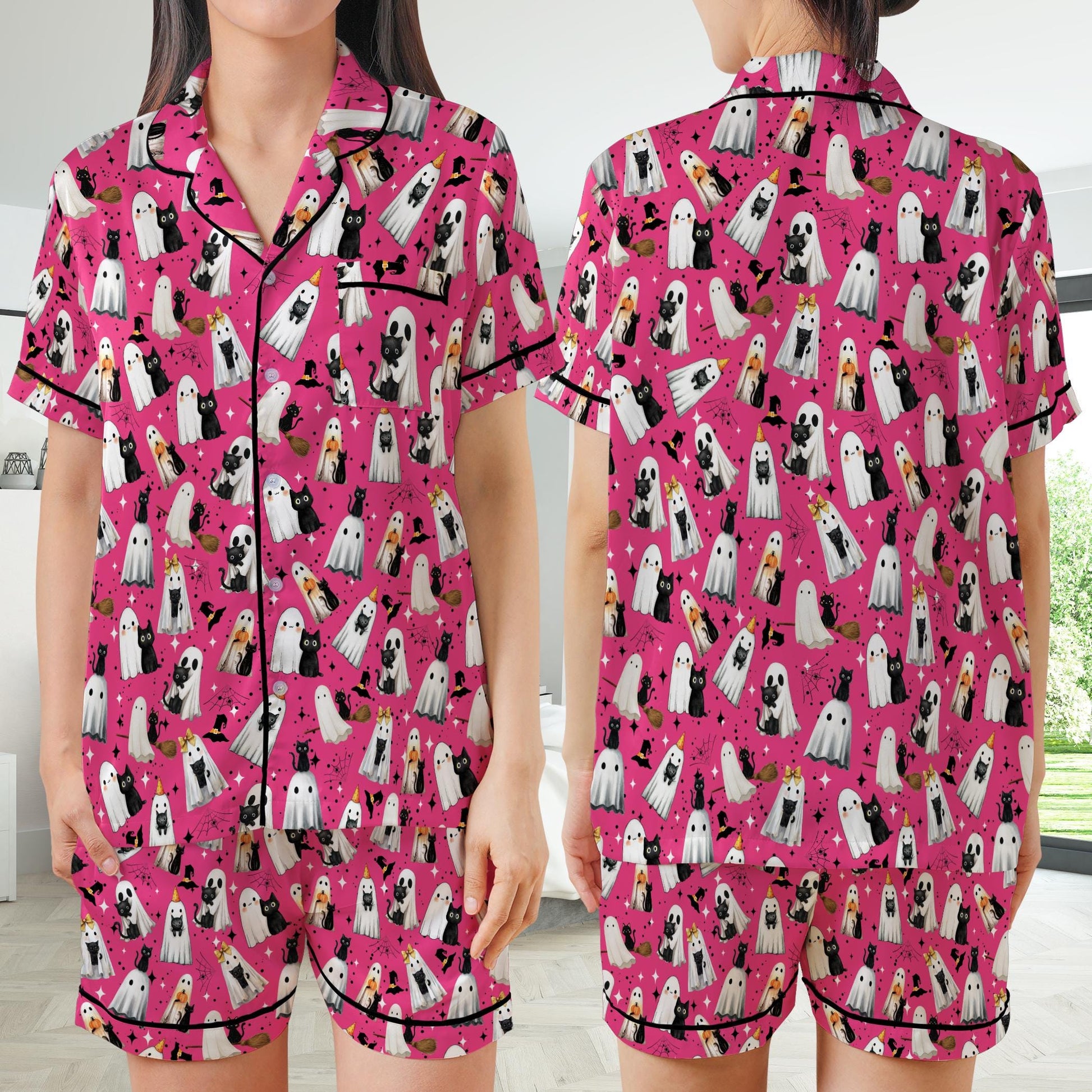 Black Cat Halloween Satin Pajamas Set, Spooky Season Pajama Set, Boo Ghost Cat Lover Sleepwear, Funny Cat Mama Halloween Pajamas Set