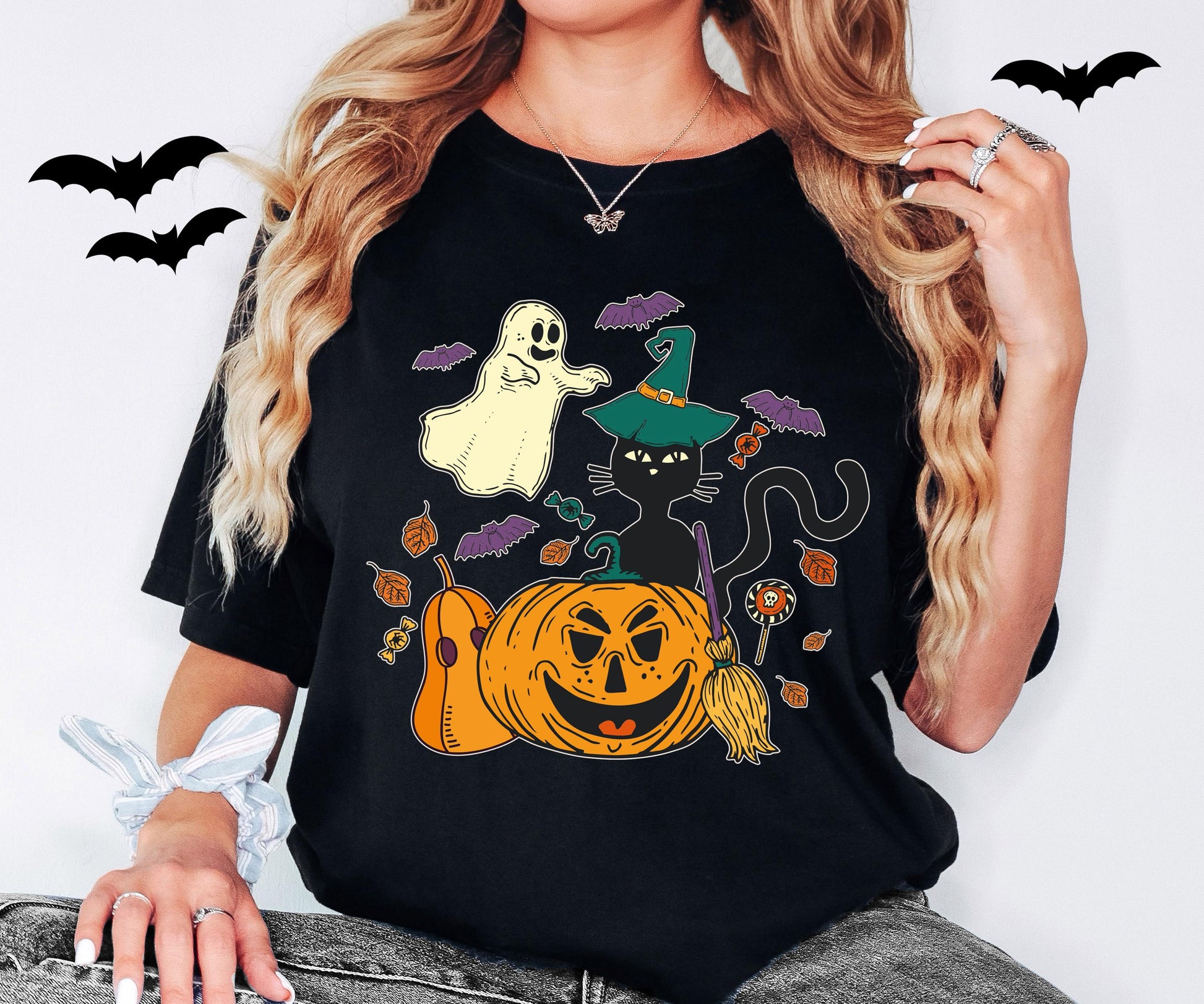 Black Cat Pumpkin Shirt, Cat Halloween Sweatshirt, Ghost Cat Shirt, Witch Spooky T-Shirt, Spooky Season Tee, Cat Lover Halloween Shirt