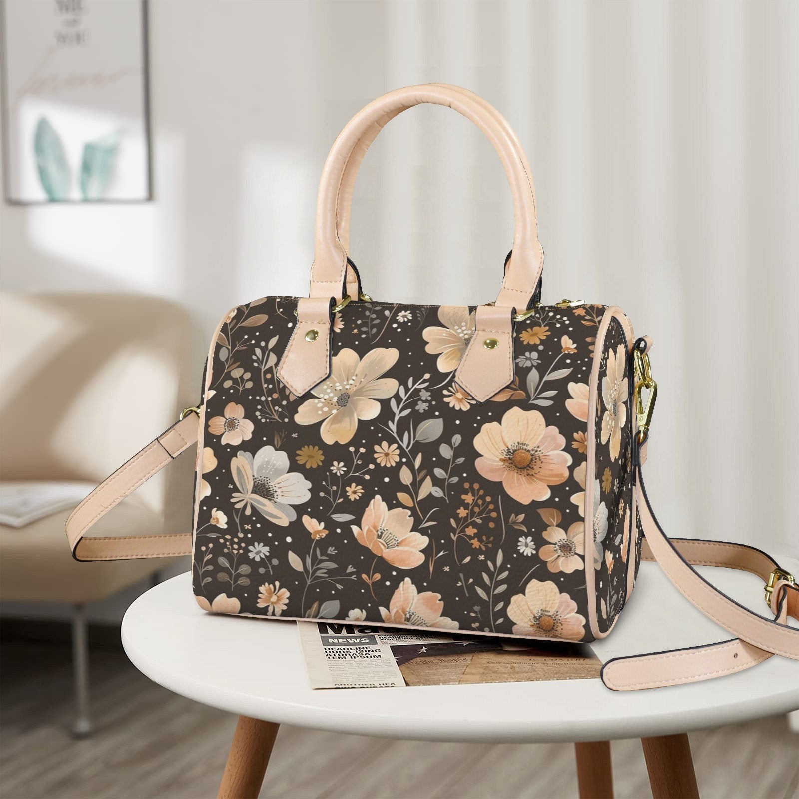 Blossom Brownie Leather Boston Handbag. Waterproof PU Leather Handbag, Top Handle Vegan Leather, Crossbody, Shoulder bag.