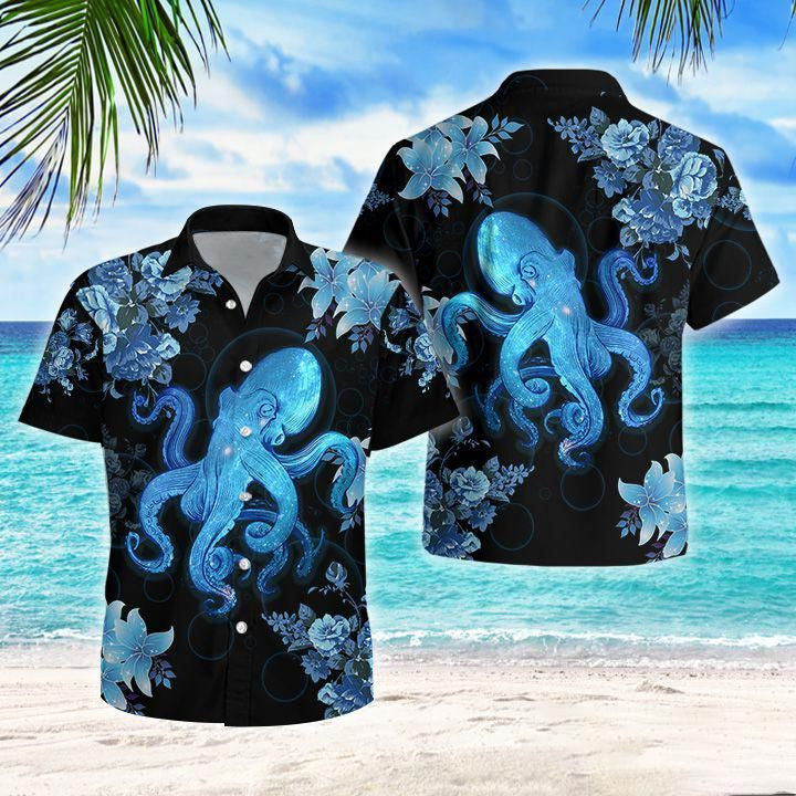 Octopus Gorm Agus Bláth Neon Dath Téama Dubh Léine Haváís, Bronntanas Léine Haváíais, Bronntanas Nollag