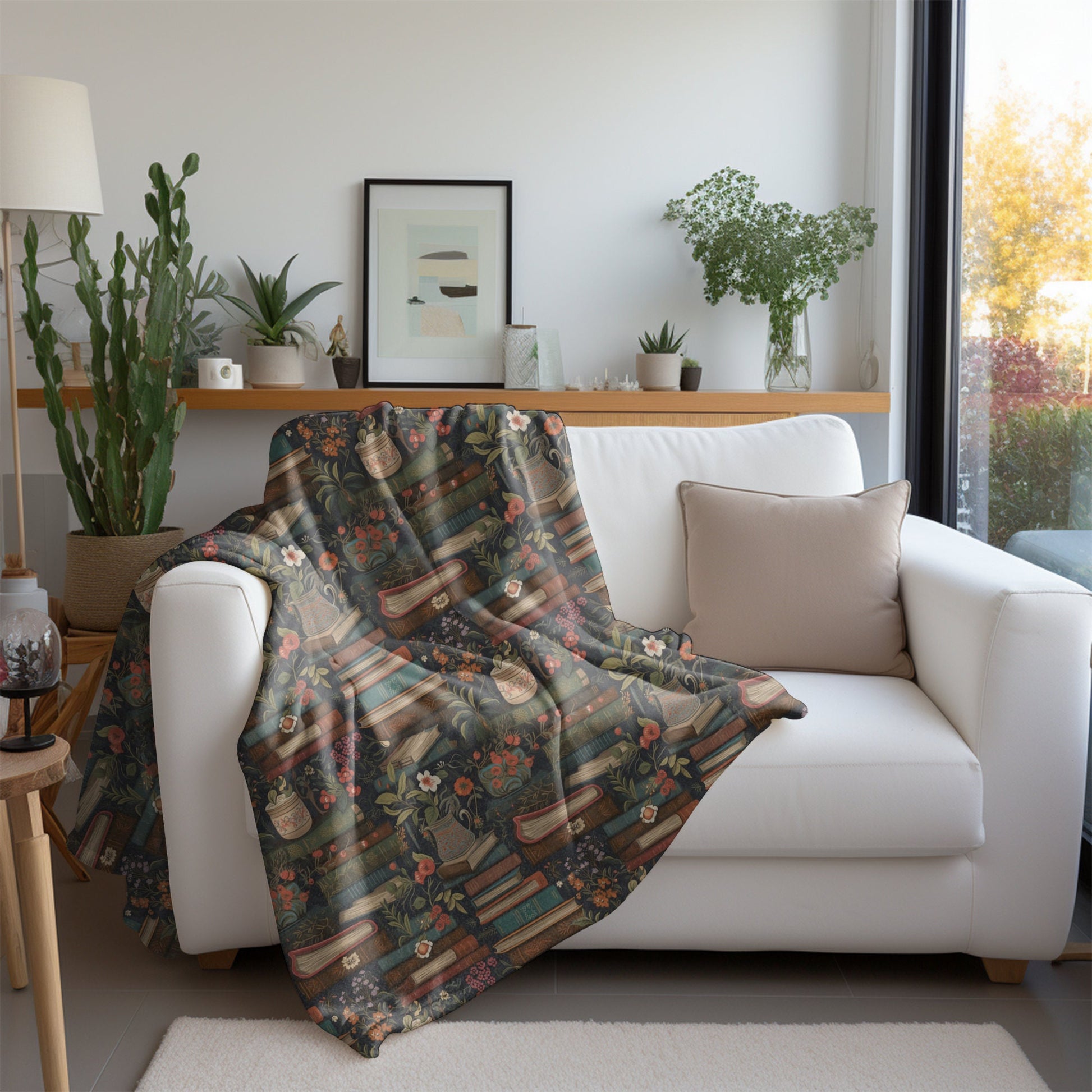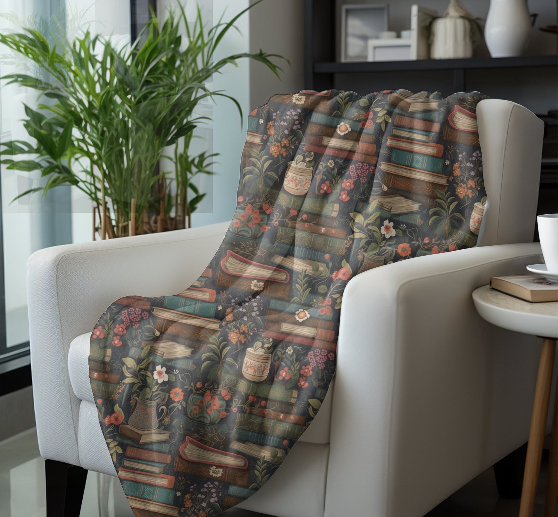 Bookish Throw Blanket Reading Minky Blanket, Folk Art Warm Blanket, Bookworm Fleece Throw Gift for Reader Book Nook Throw, Christmas Gift