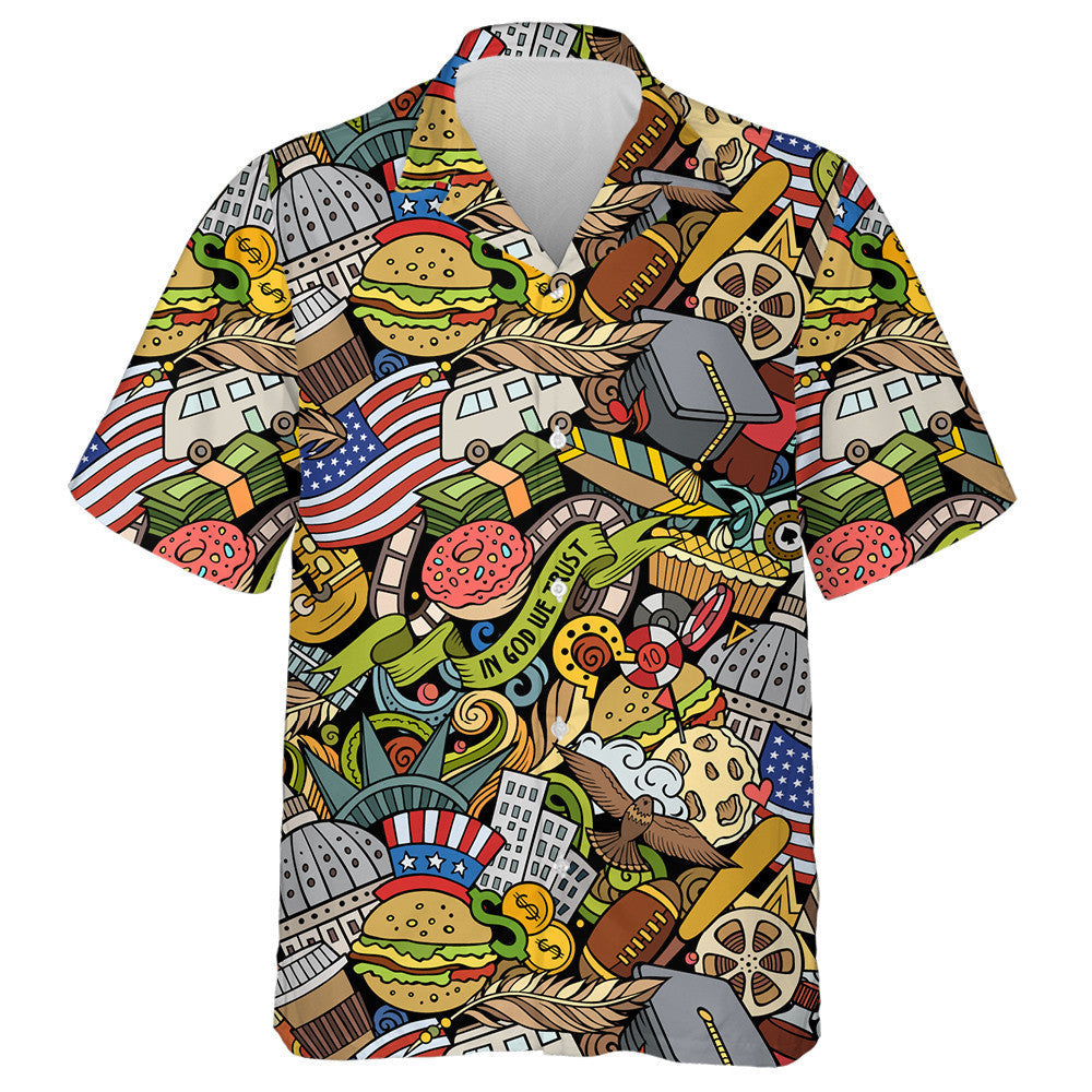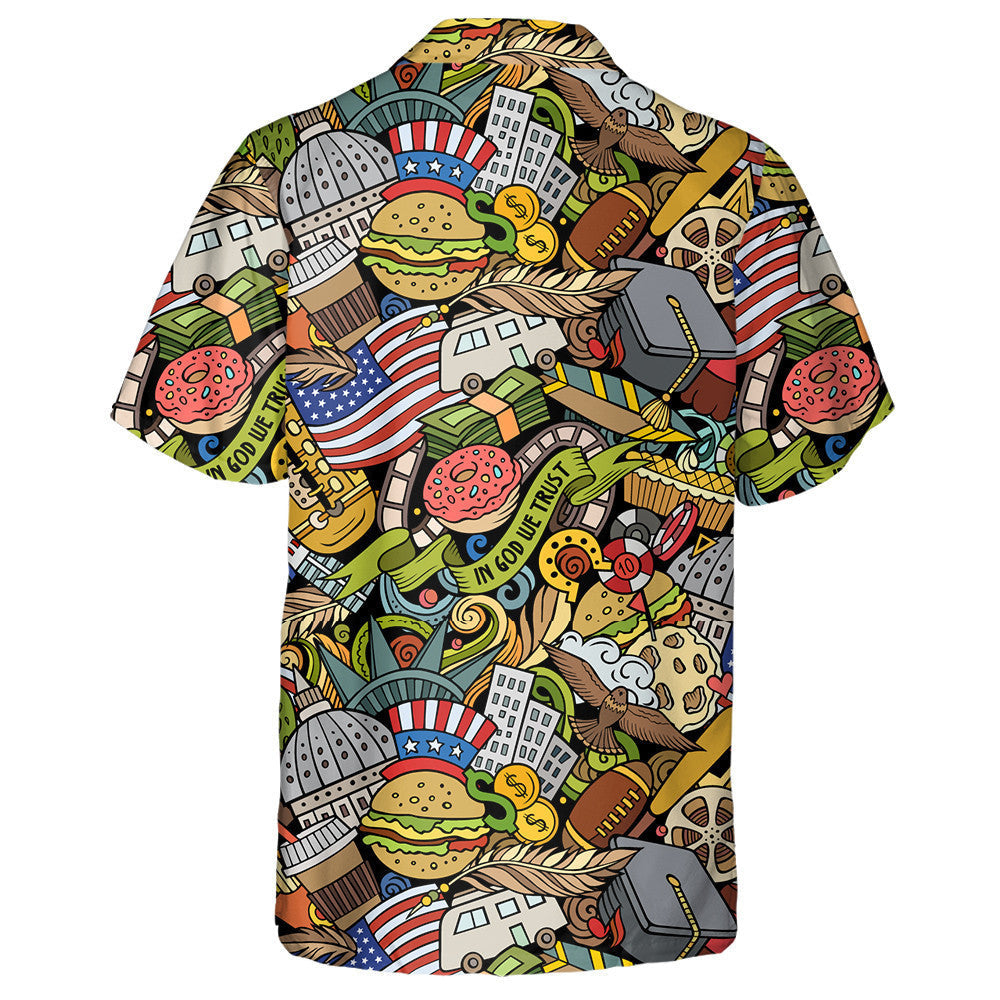 Cúlra Doodles Cartúin le Siombailí agus Míreanna Cultúir Mheiriceánaigh Léine Haváís, Bronntanas Léine Haváíais, Bronntanas Nollag