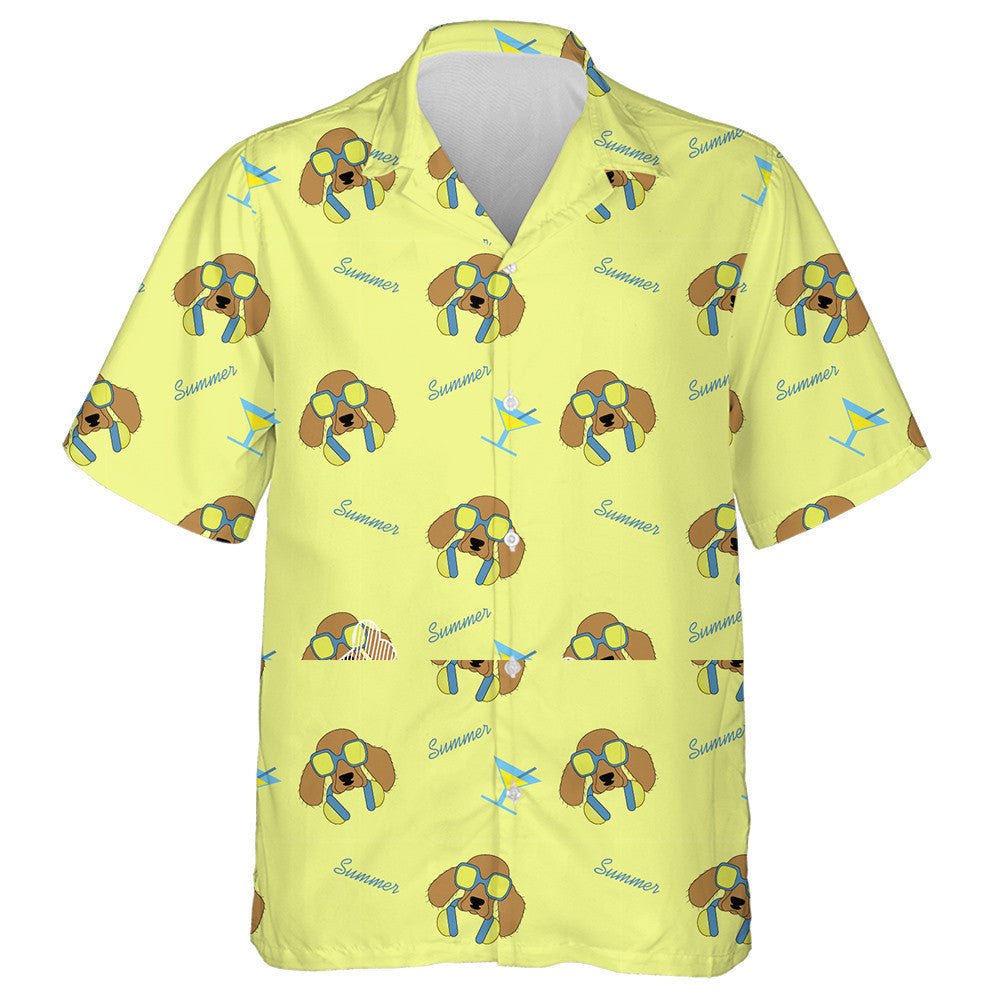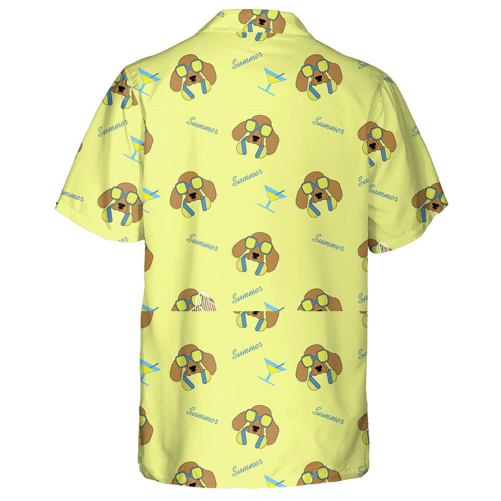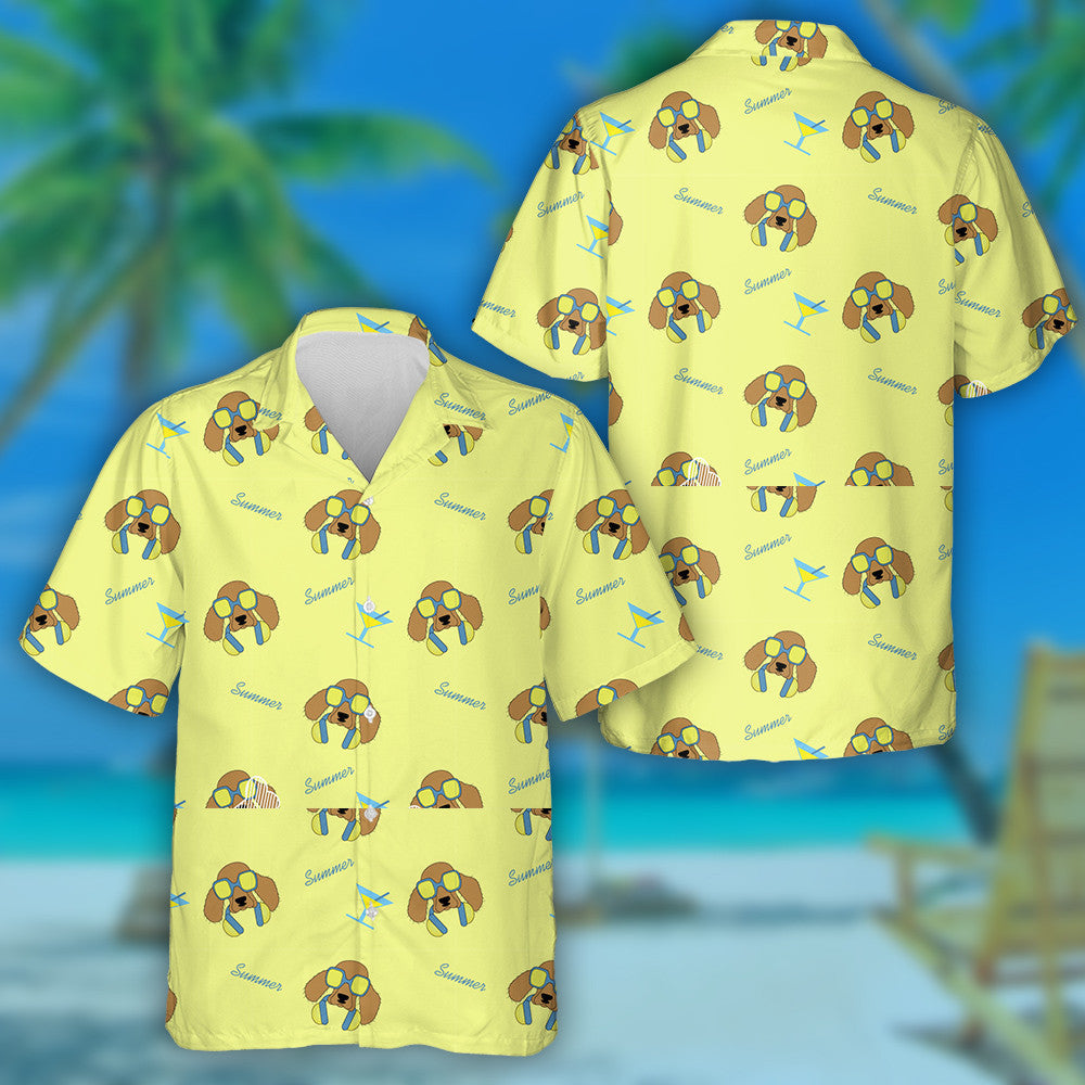 Cúlra Madraí Cartún Spaniel i spéaclaí gréine agus cluasáin Léine haváí, bronntanas Léine haváí, bronntanas Nollag
