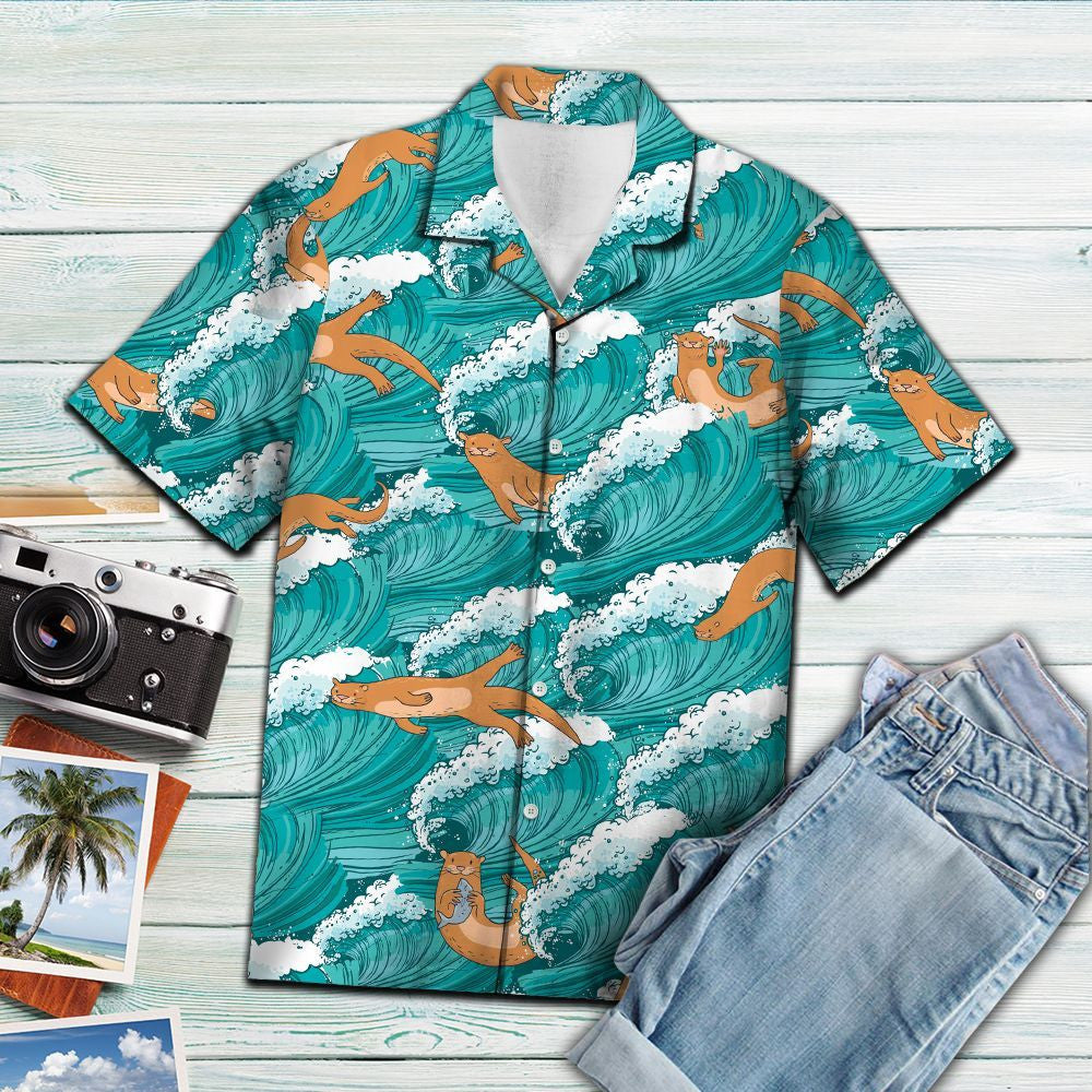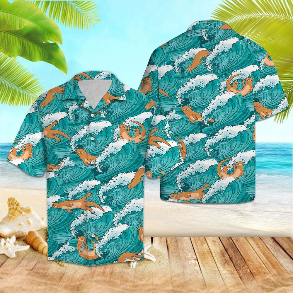 Cartoon Dobharchú Fiáin ag Léim Ar Thonnta Farraige Patrún Léine Haváís, Bronntanas Léine Haváís, Bronntanas Nollag