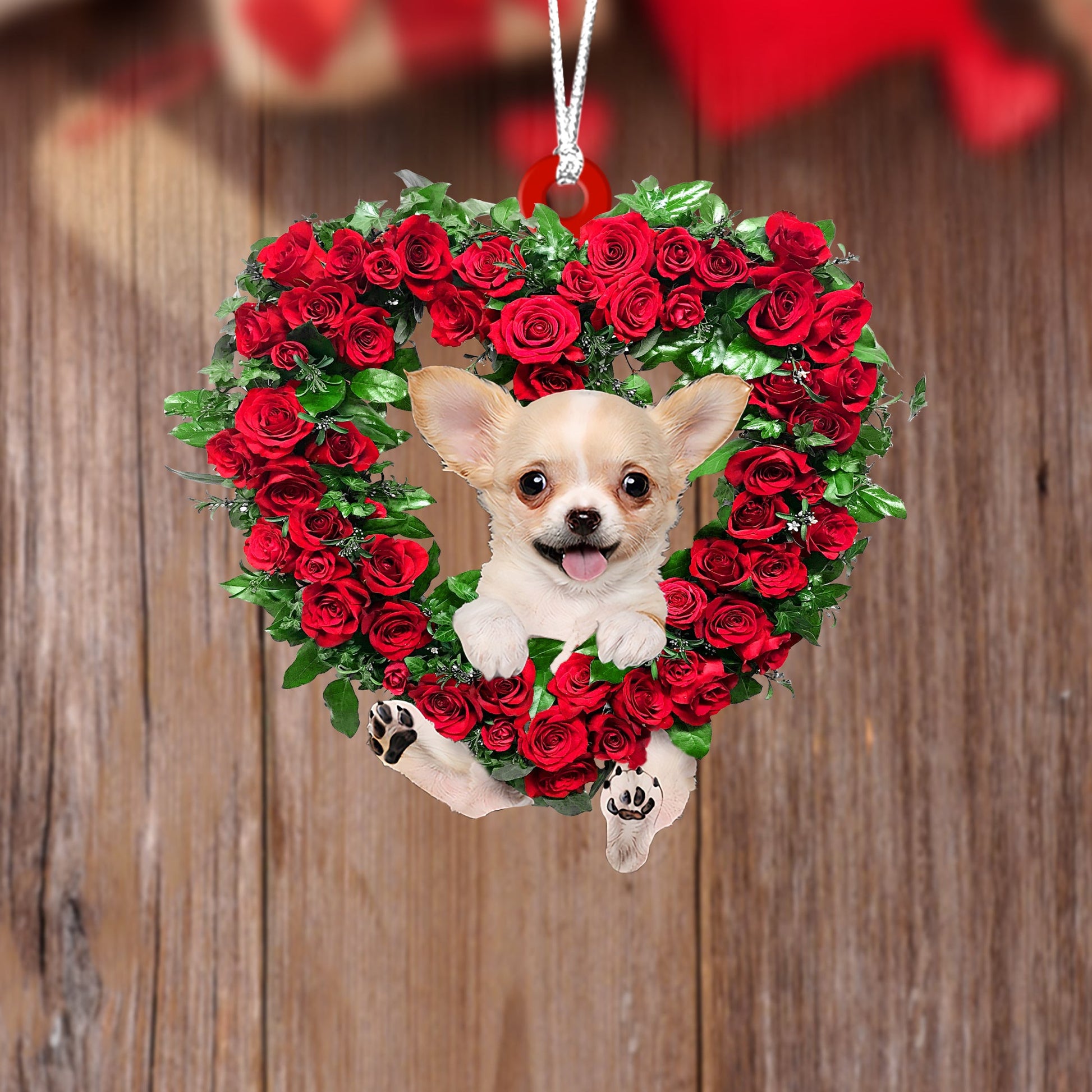 Wreath Chihuahua-Croí Dhá thaobh Ornáid Crochta Plaisteacha Nollag, Ornáid Nollag Shona, Bronntanas Nollag, Maisiú Nollag