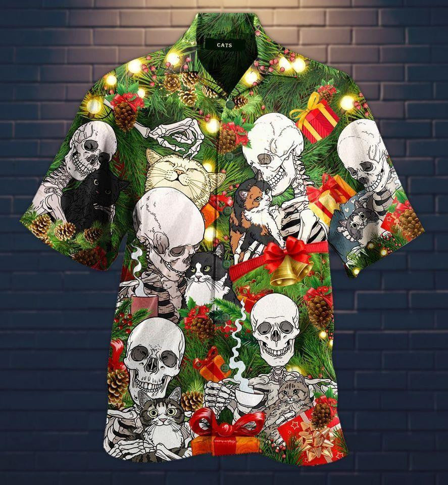 Cloigeann Nollag Grá Cat Cúlra Glas Dearadh Léine Haváís, Bronntanas Léine Haváíais, Bronntanas Nollag