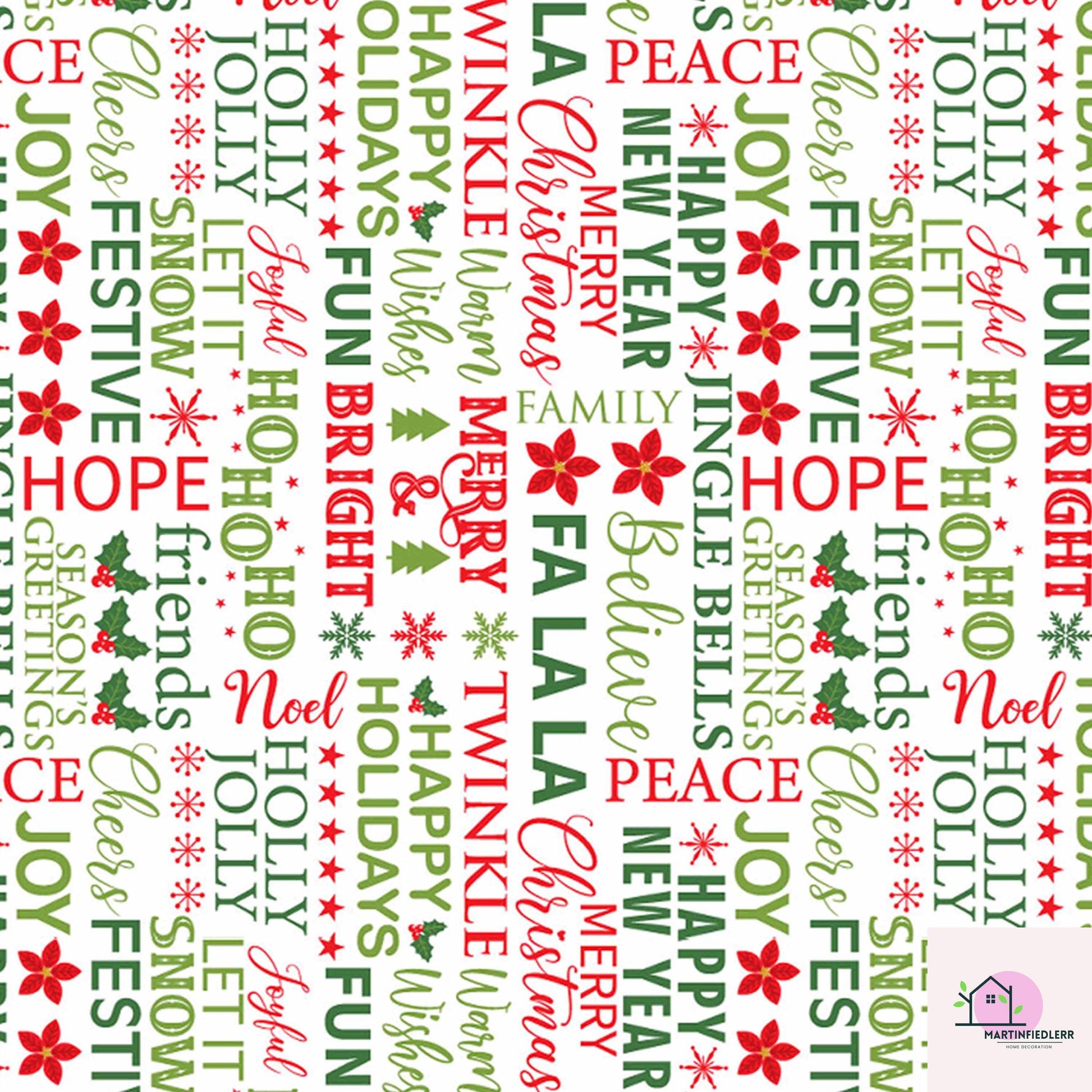 Christmas Typography Wrapping Paper, Holiday Word Art Gift Wrap Sheets, Red Green Lettering Packaging, Festive Modern Winter Party Style