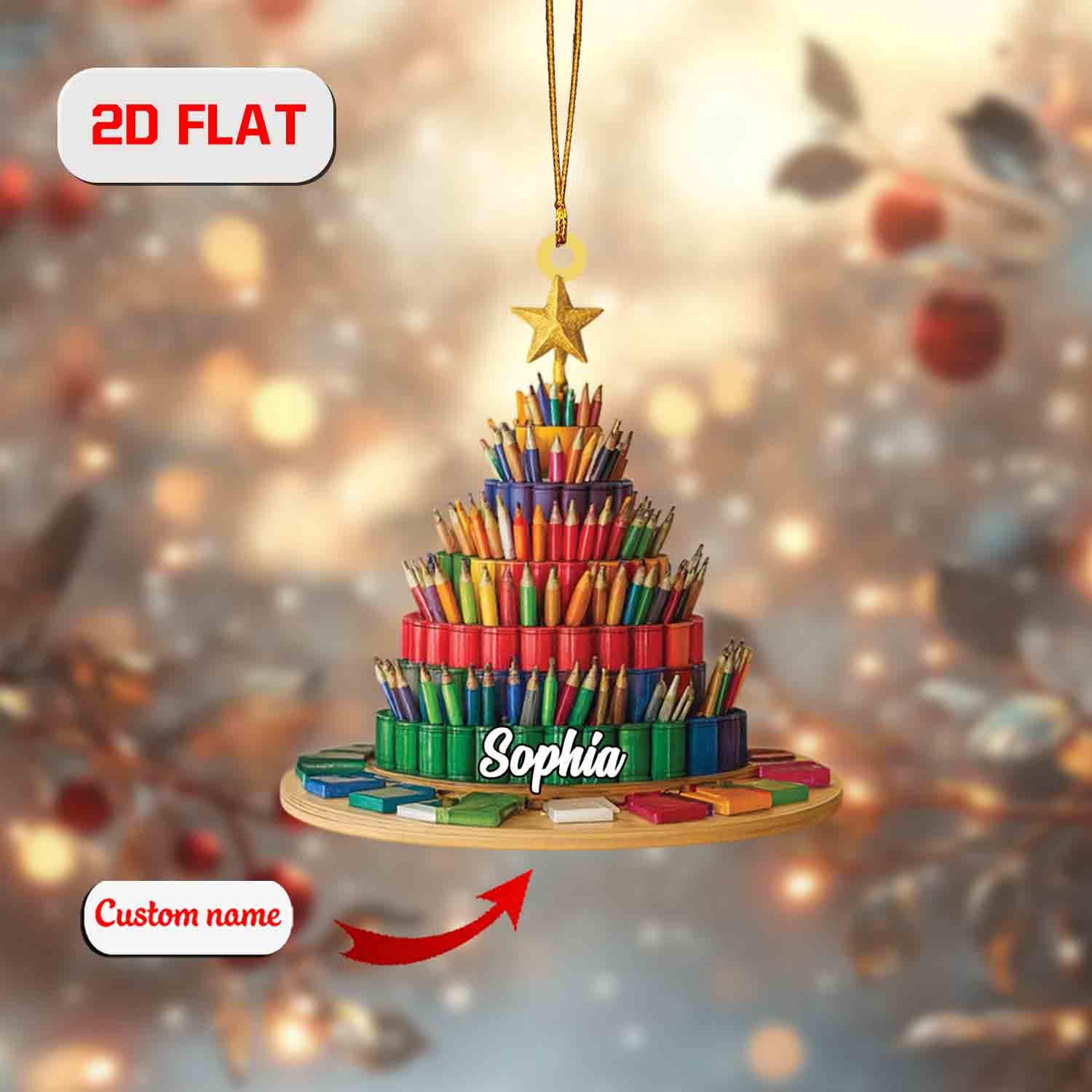 Custom 2D Flat Pencil Tree Ornament, Personalized Acrylic Christmas Ornament with Name, Teacher Gift, Art Lover Holiday Decor, Xmas Gift
