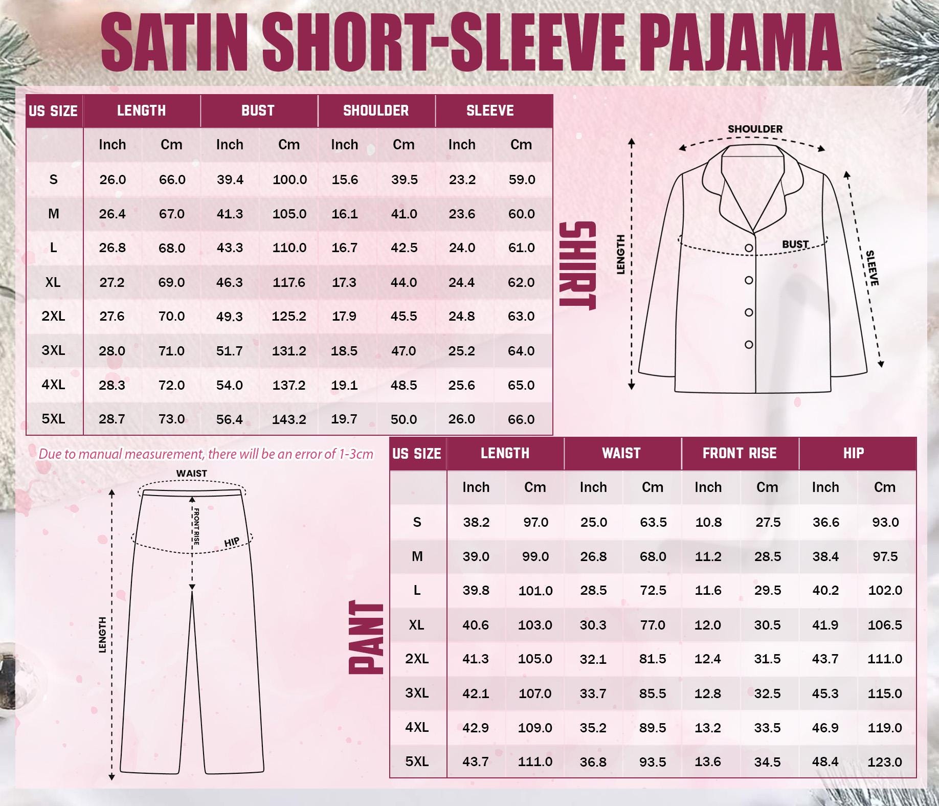- Due to manual measurement, please allow a tolerance of 1–3 cm.