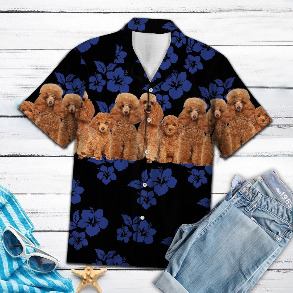 Poodle gleoite Le Hibiscus Gorm I nDearadh Dubh Léine Haváís, Bronntanas Léine Haváíais, Bronntanas Nollag