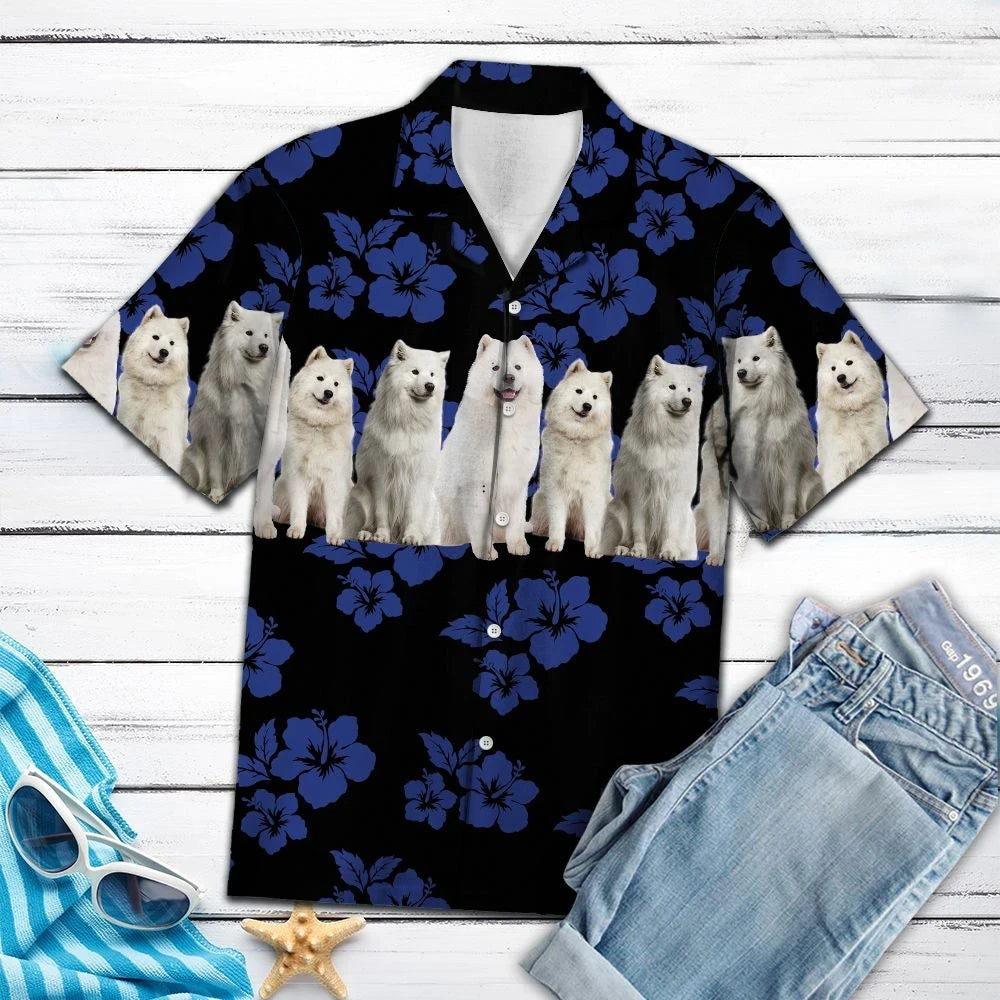 Madraí gleoite Samoyed le Hibiscus Gorm I Léine Dubh Haváís, Bronntanas Léine Haváise, Bronntanas Nollag