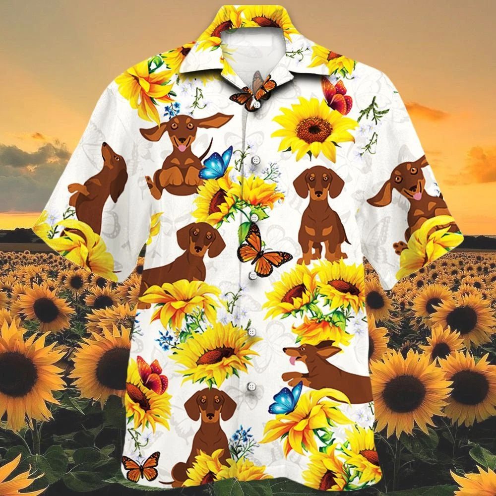 Madra Dachshund le Féileacán Ar Léine Haváí Ghairdín Bláthanna na Gréine, Bronntanas Léine Haváíais, Bronntanas Nollag