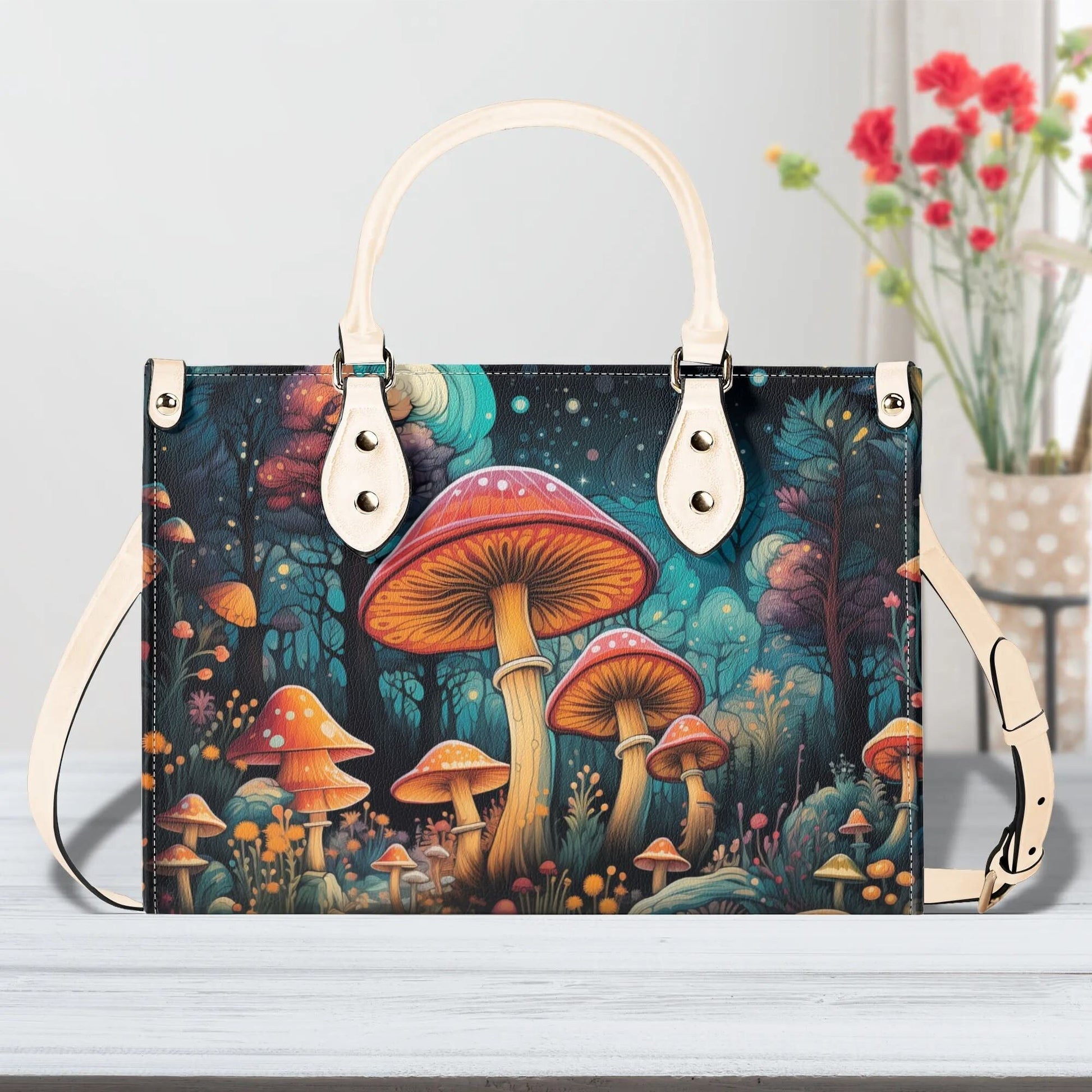 Enchanted Mushroom Grove Tote Handbag. Square Handbag, Waterproof PU Leather Tote, Top Handle Vegan Leather, Crossbody, Shoulder bag.