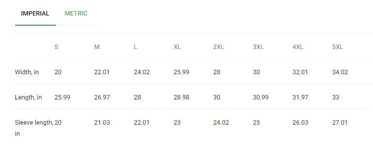 | US Size | Chest (Inch) | Chest (Cm) | Length (Inch) | Length (Cm) | Sleeve (Inch) | Sleeve (Cm) |