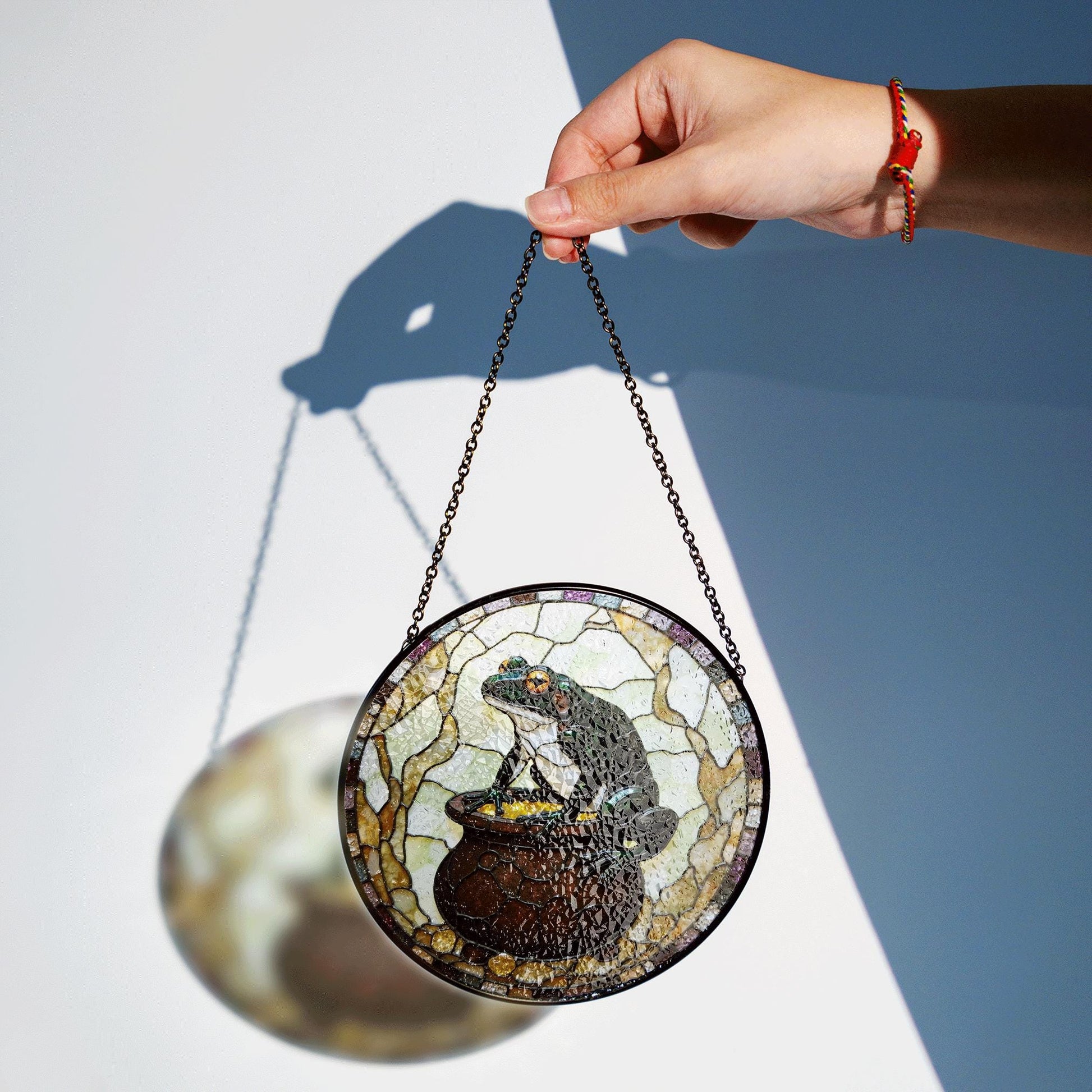 Frog with gold cauldron stained glass suncatcher witchy window decor Halloween gift for frog lover