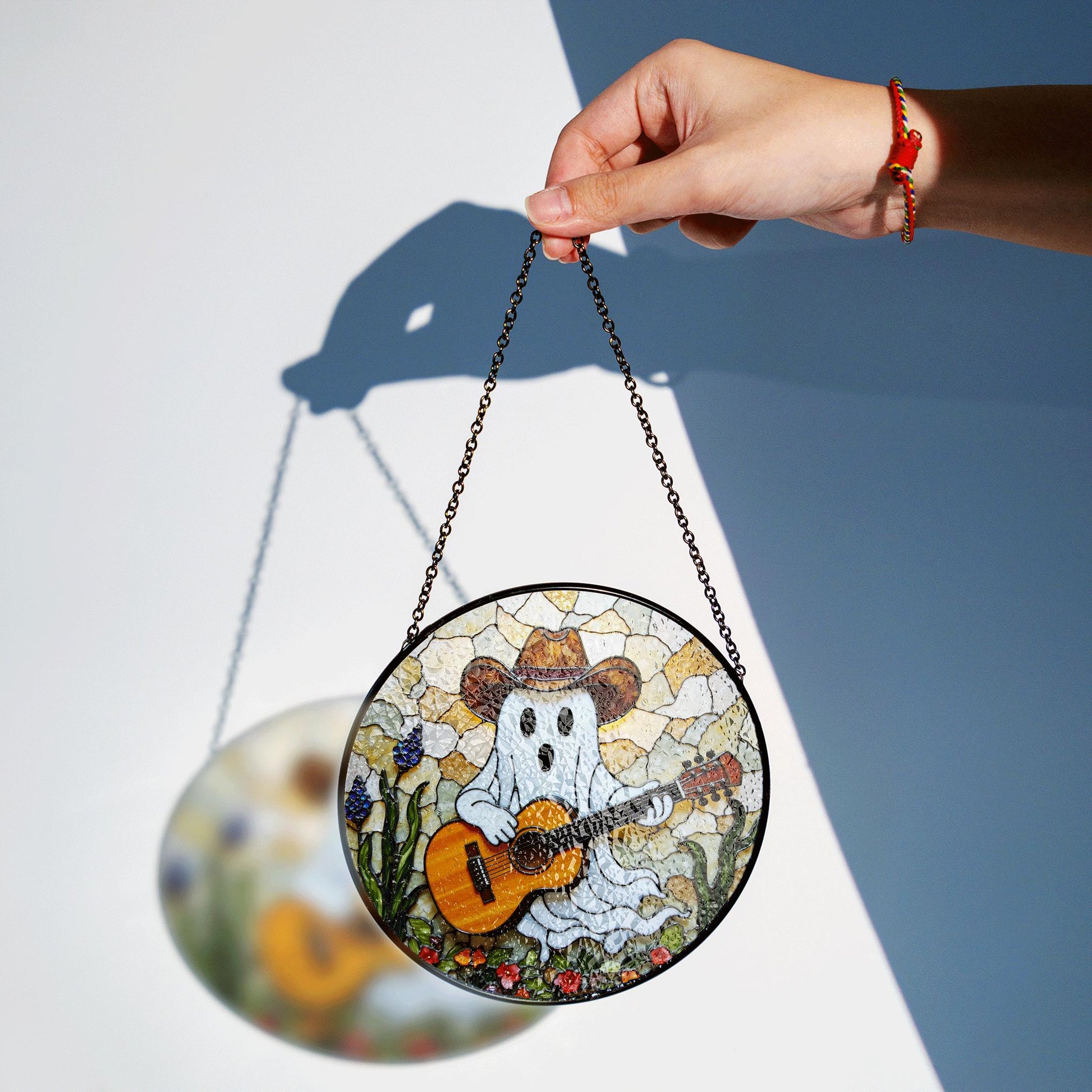 ghost playing guitar stained glass suncatcher funny halloween window decor gift for him