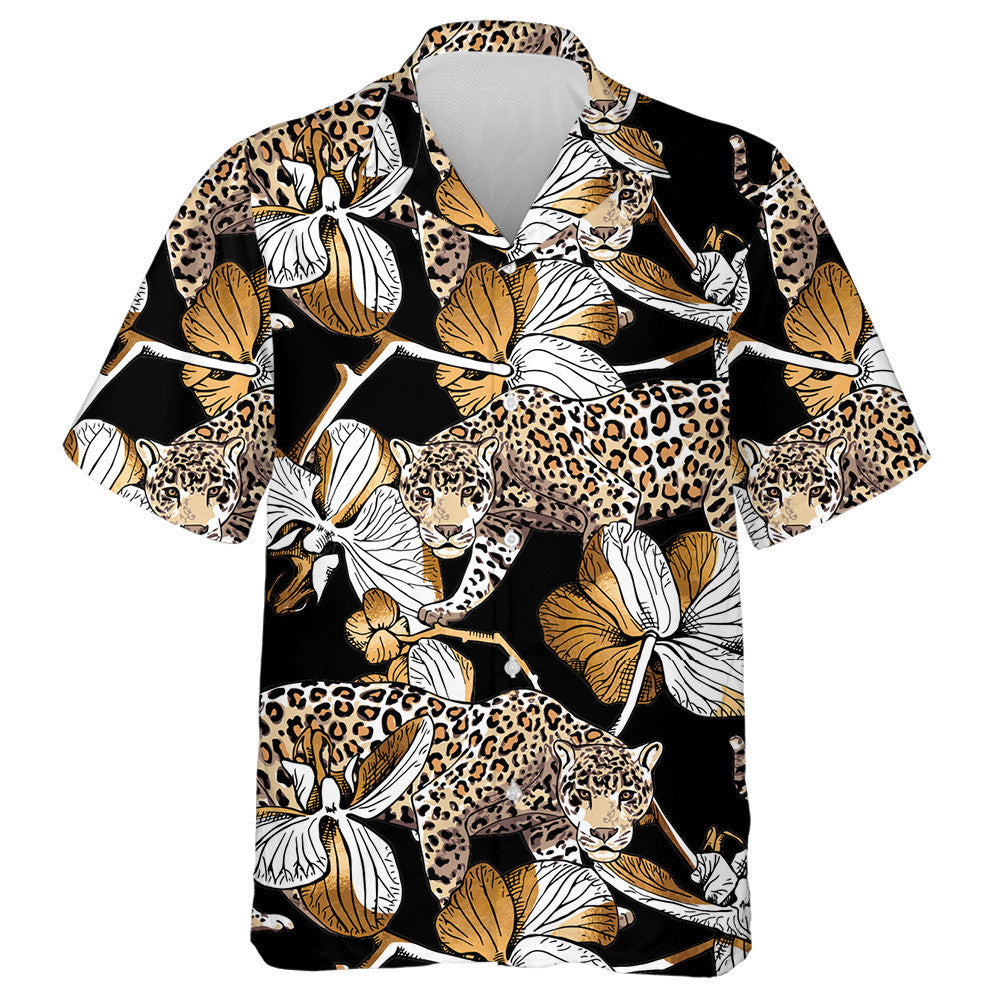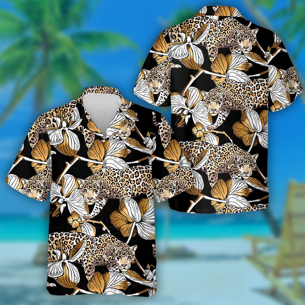Bláthanna Liopard Óir Agus Magairlín ar Chúlra Dubh Léine Haváís, Bronntanas Léine Haváís, Bronntanas Nollag