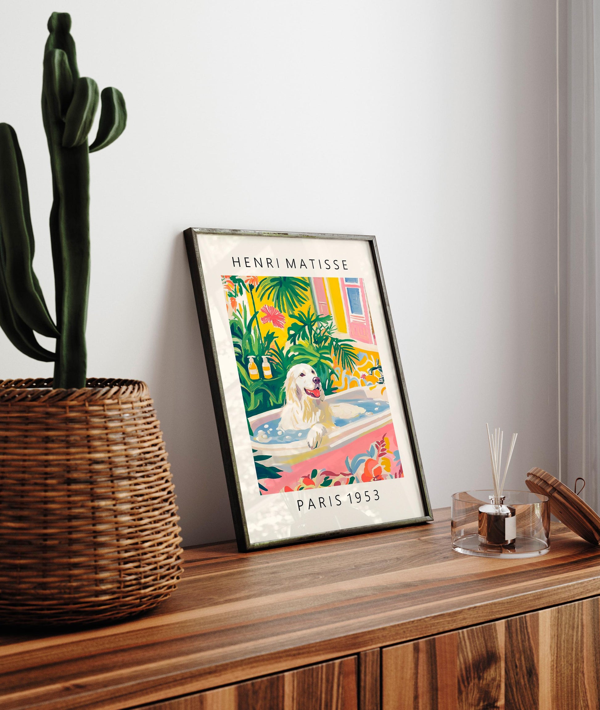 Great Pyrenees in bathtub, Matisse wall art, Funny bathroom poster for dog lovers, Pink dopamine decor, Dog art print