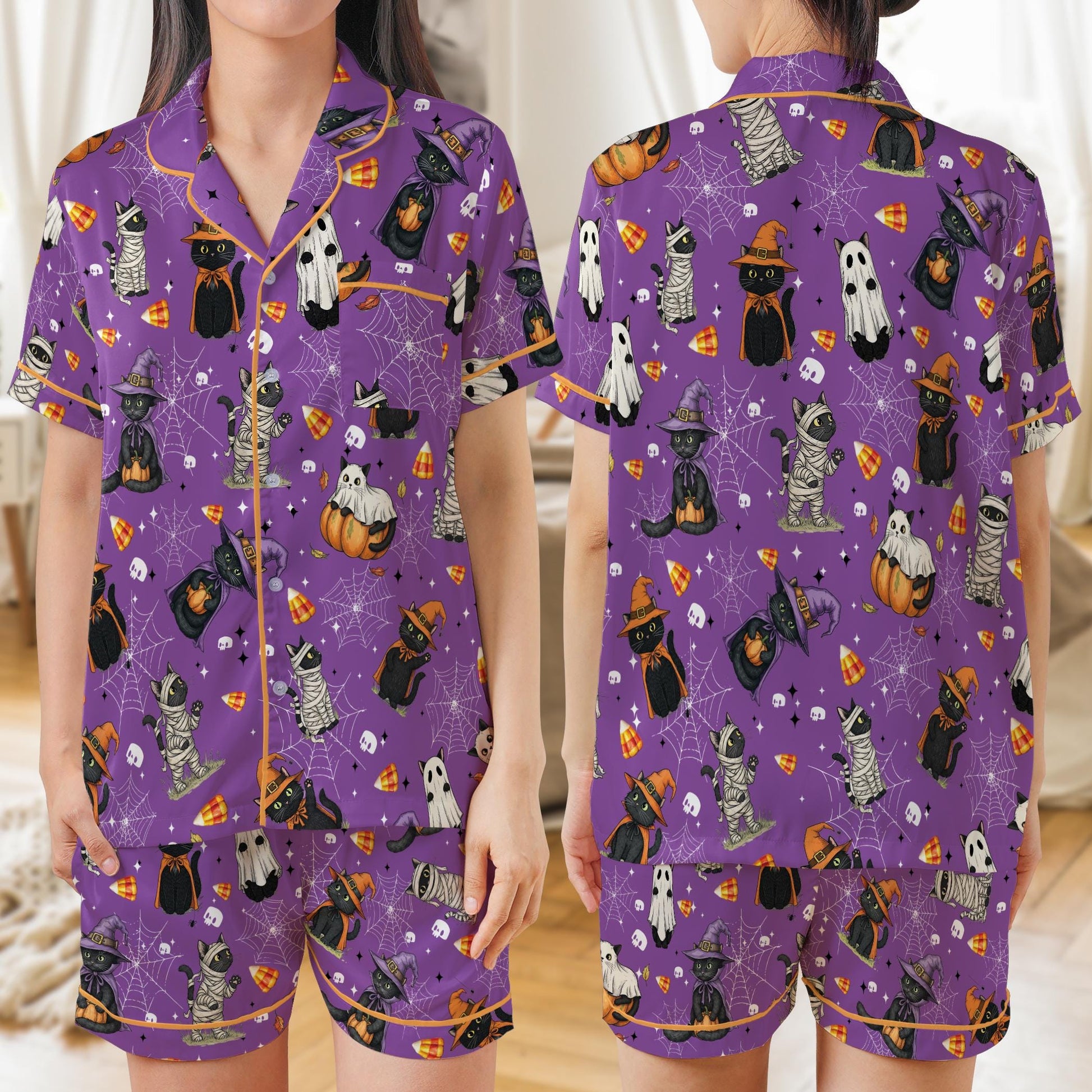 Halloween Cat Pajama Set, Cute Boo Cat Sleepwear, Spooky Black Cat Loungewear, Funny Ghost Mummy Witch Cat PJs, Gothic Halloween Pajamas