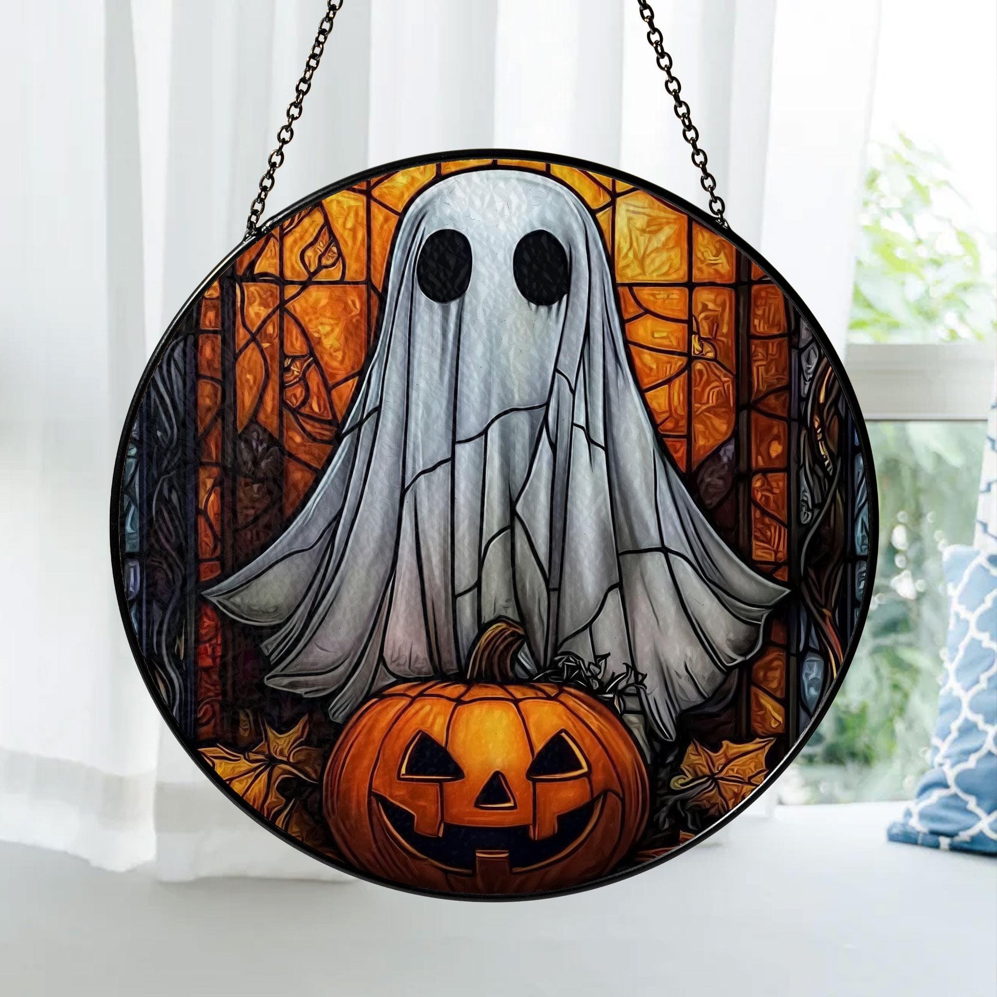 Halloween Ghost Stained Glass Suncatcher – Spooky Ghost with Pumpkin Window Hanging, Gothic Home Décor, Unique Sun Catcher Gift