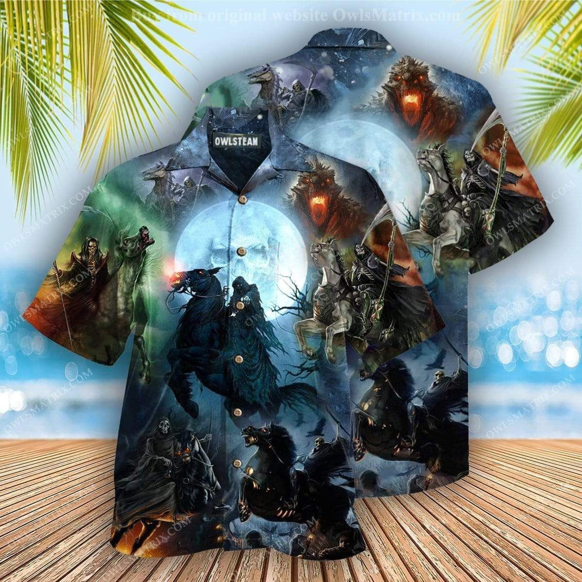Oíche Shamhna marcach gan ceann agus cúlra capall dorcha Léine haváí, bronntanas Léine haváíais, bronntanas Nollag
