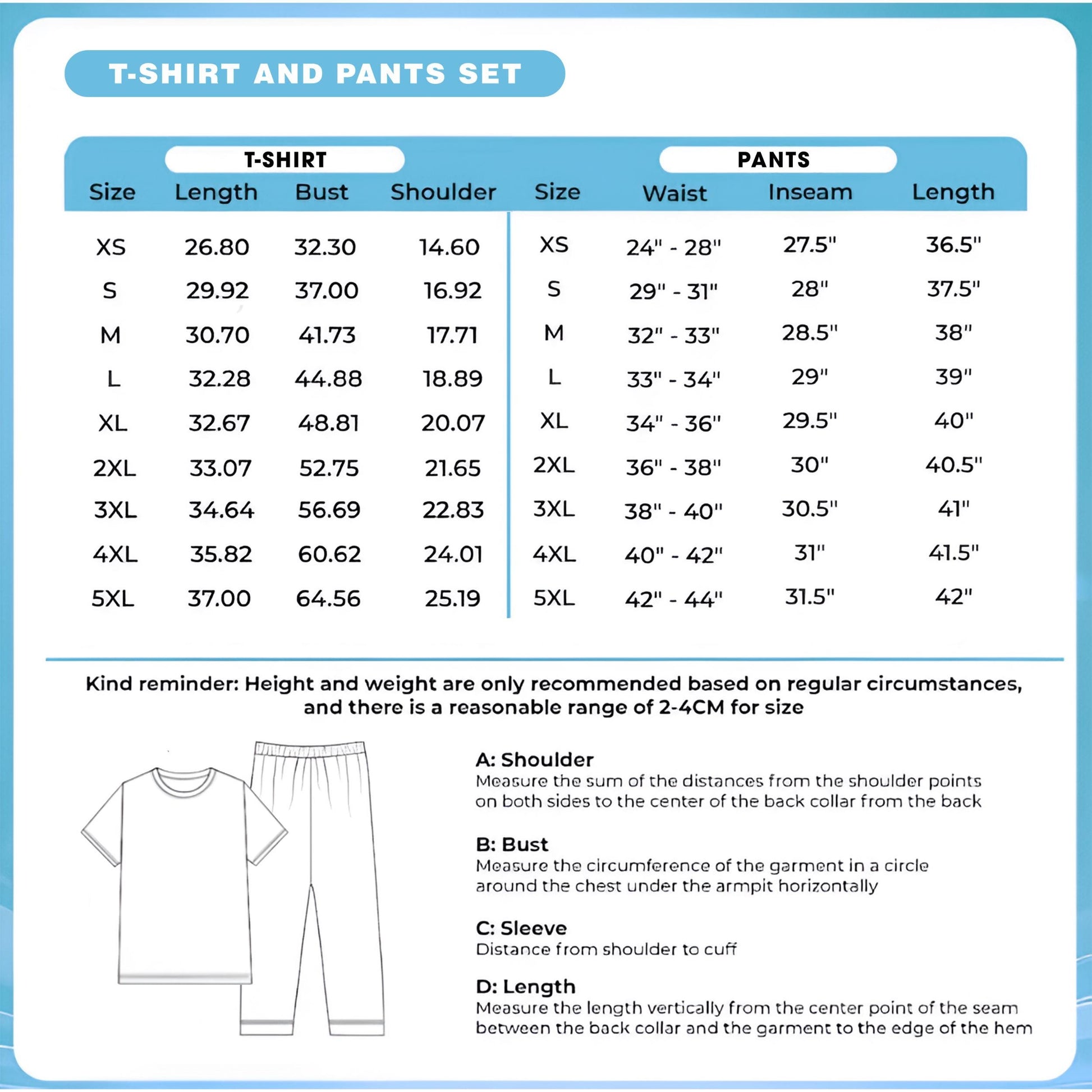 | 1/2 Chest (in/cm) | Length (in/cm) | Sleeve (in/cm) | Waist (in/cm) | Length (in/cm) | Inseam (in/cm) | |