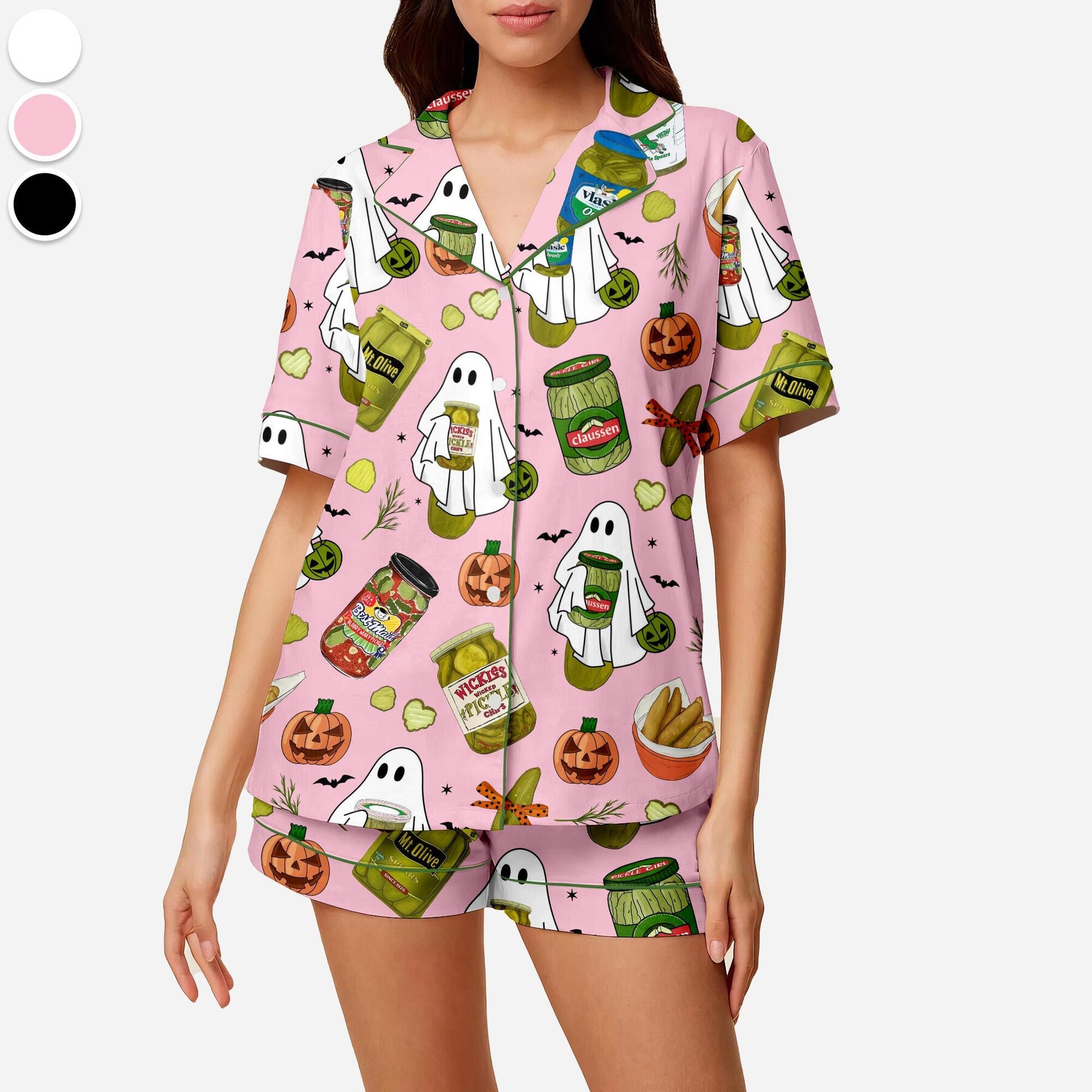 Halloween Pickle Print Satin Pajamas Set Printed Comfortable Satin Pajamas and Loungewear Pjs Short Sleeve Top & Shorts Withought Pockets
