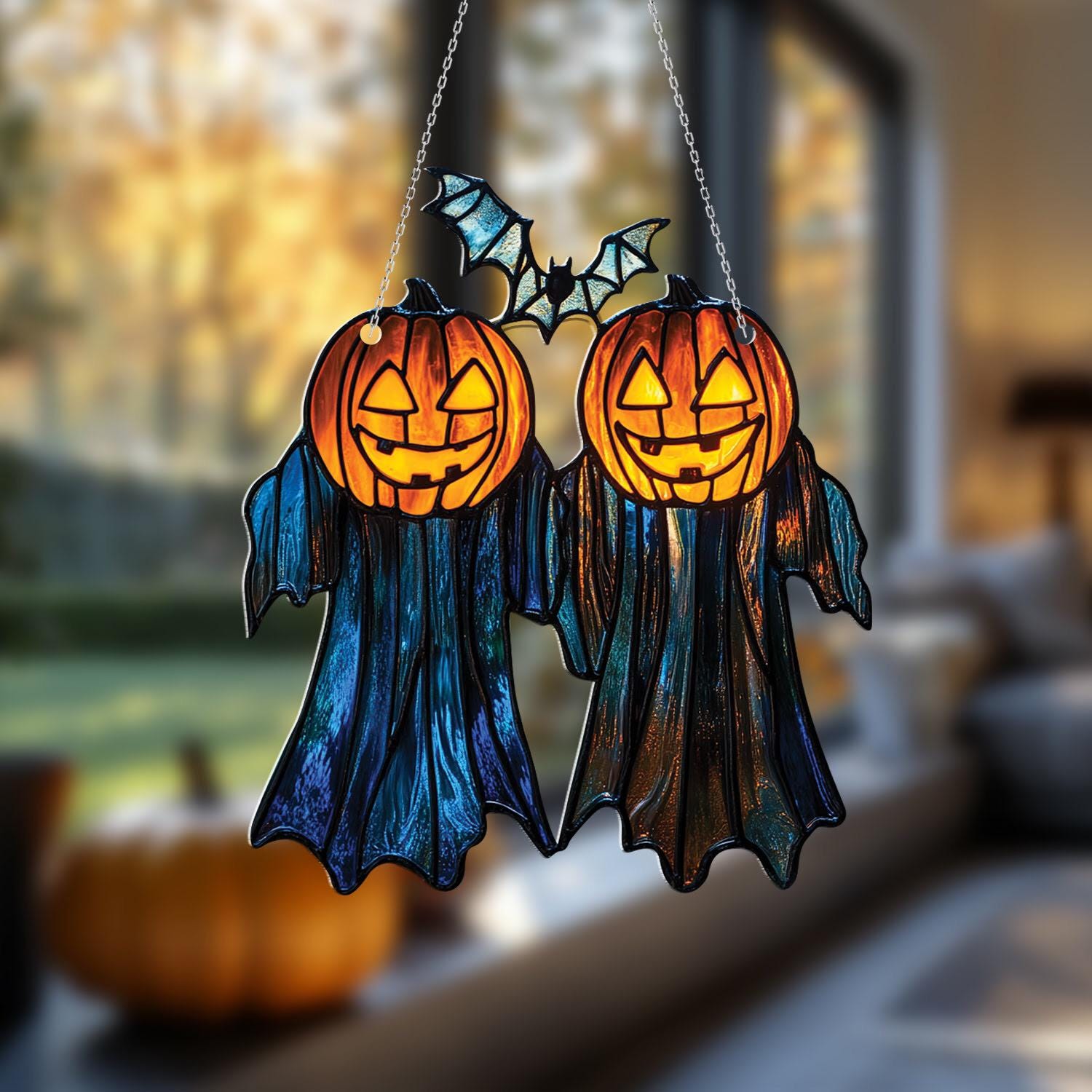 Halloween Pumpkin Ghost Duo Window Hanging, Spooky Autumn Decor, Gothic Jack O’Lantern Ornament for Fall and Halloween Decoration