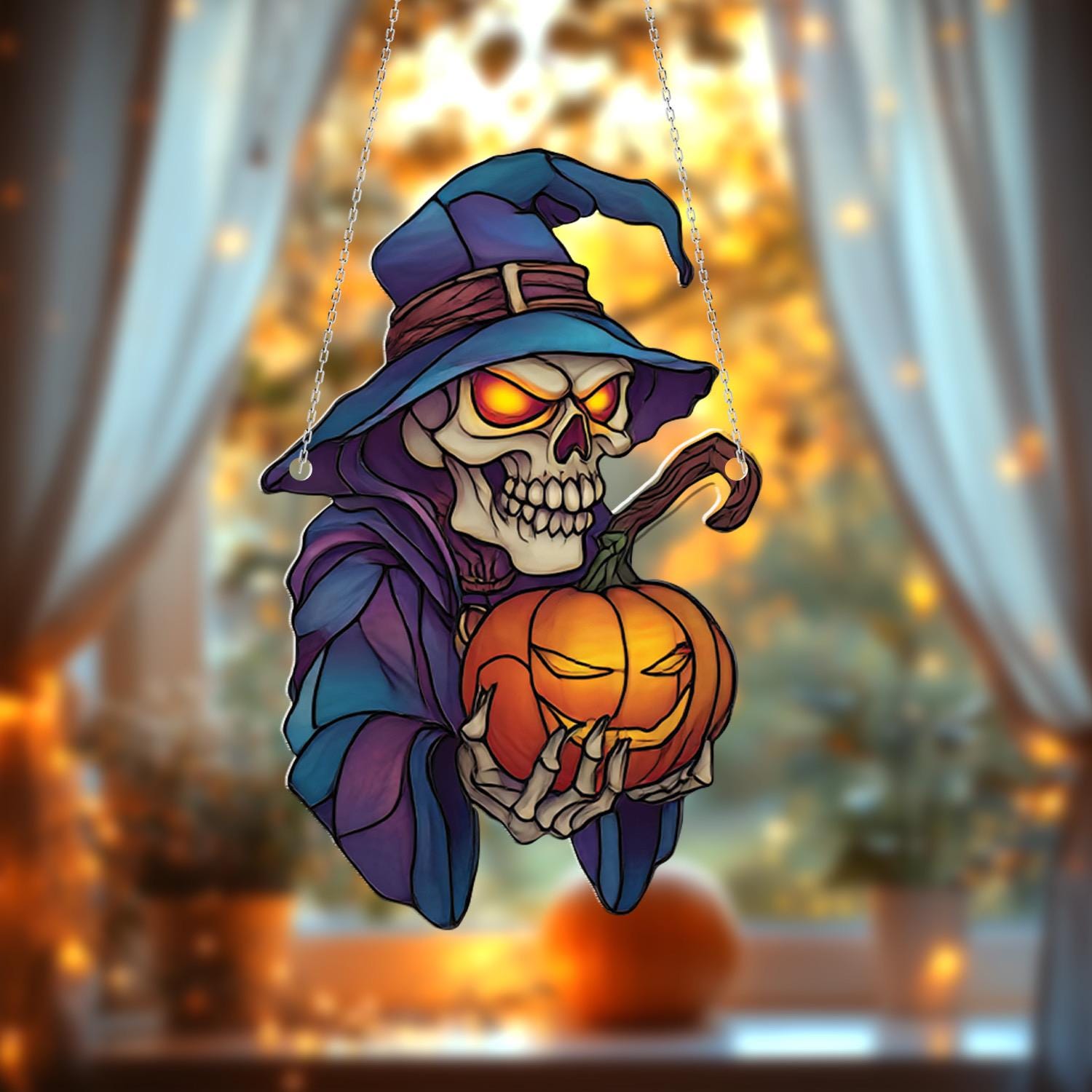 Halloween Skeleton Wizard Window Hanging with Glowing Pumpkin for Spooky Gothic Home Decor and Haunted House Accent