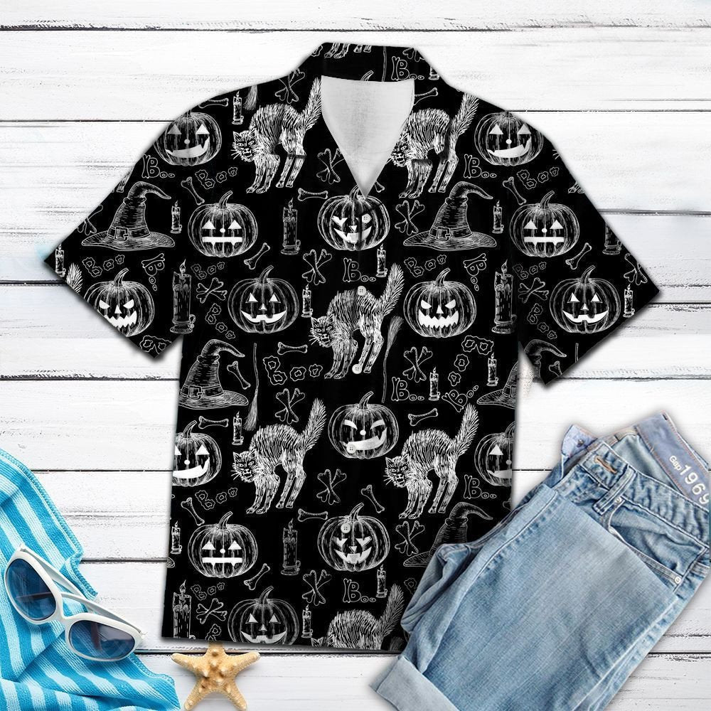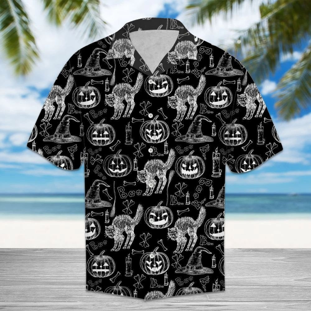 Oíche Shamhna Aghaidheanna Cat Bán Agus Pumpkin I Léine Dubh Haváís, Bronntanas Léine Haváís, Bronntanas Nollag