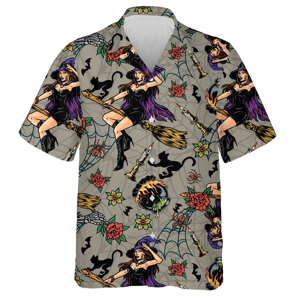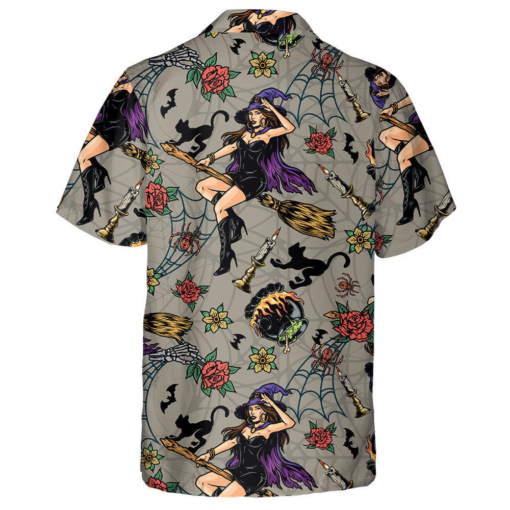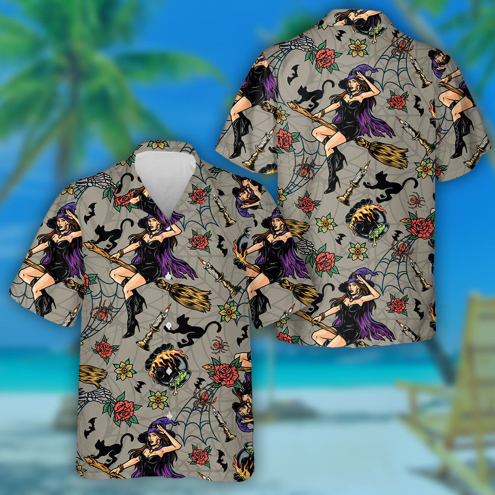 Oíche Shamhna Le Cailleach Álainn Eitilte Agus Cat Dubh Léine Haváís, Bronntanas Léine Haváíais, Bronntanas Nollag
