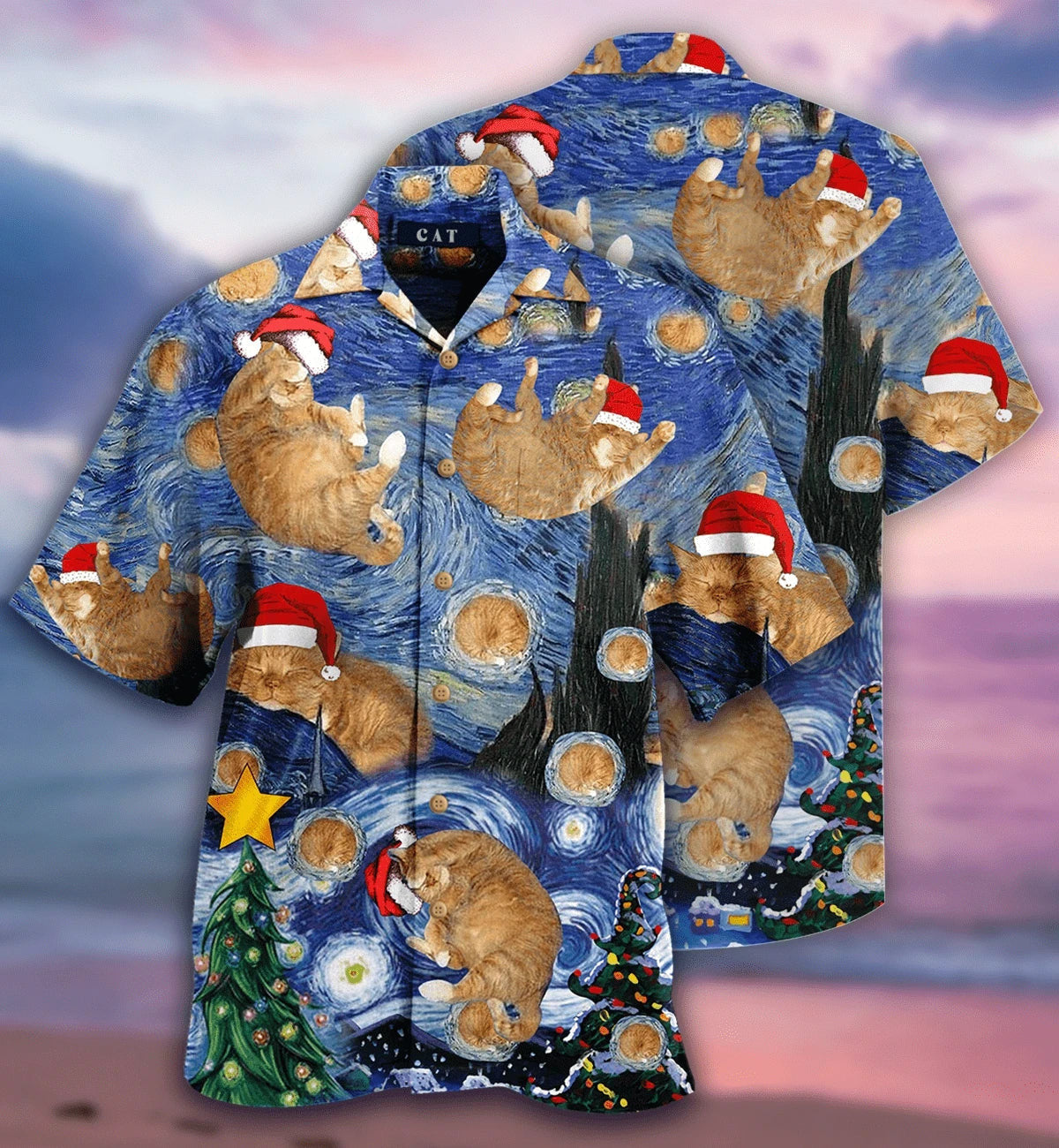 Líníocht Láimhe Cat Starry Daidí na Nollag Léine Haváís Oíche Nollag, Bronntanas Léine Haváíais, Bronntanas Nollag