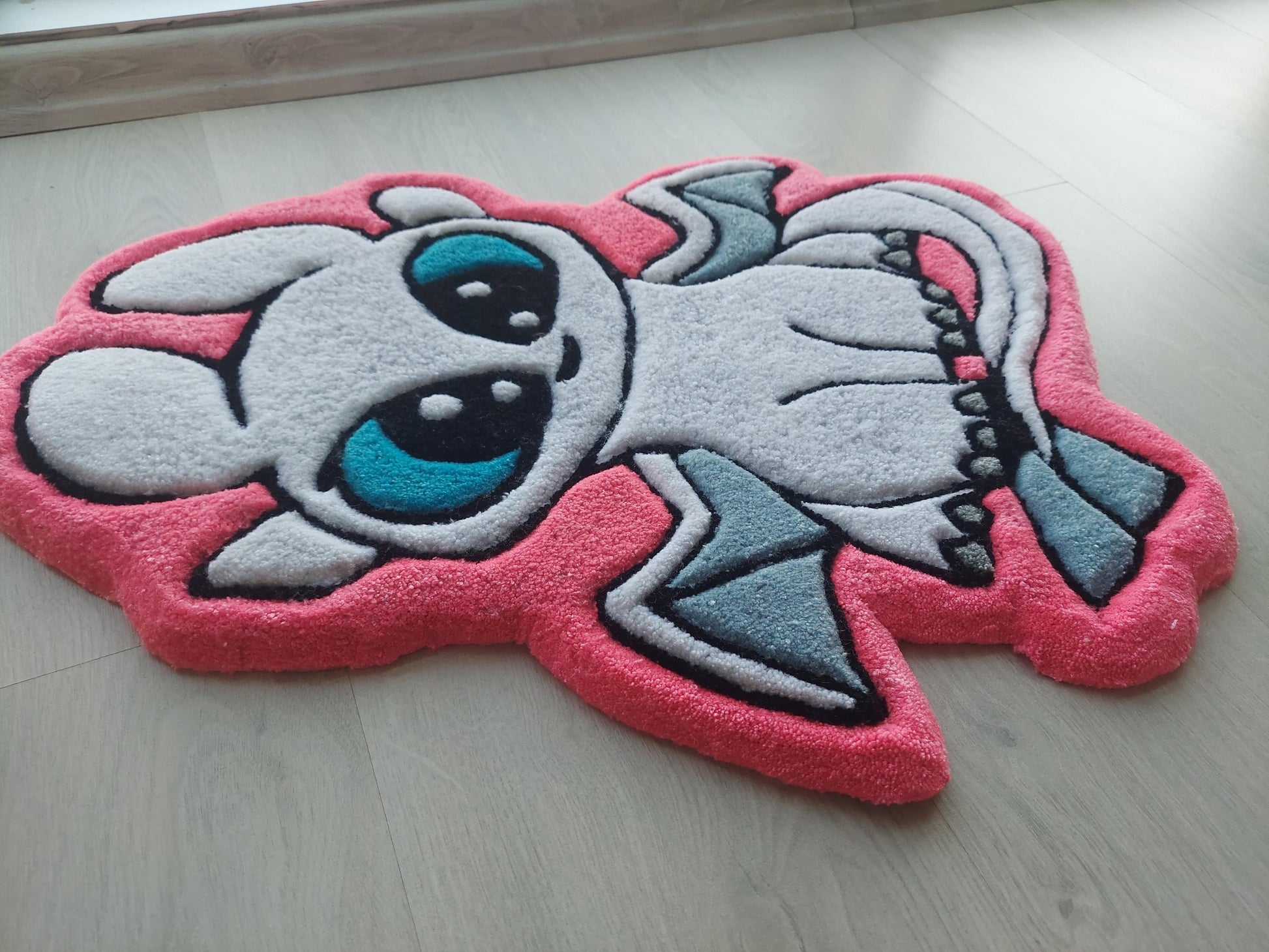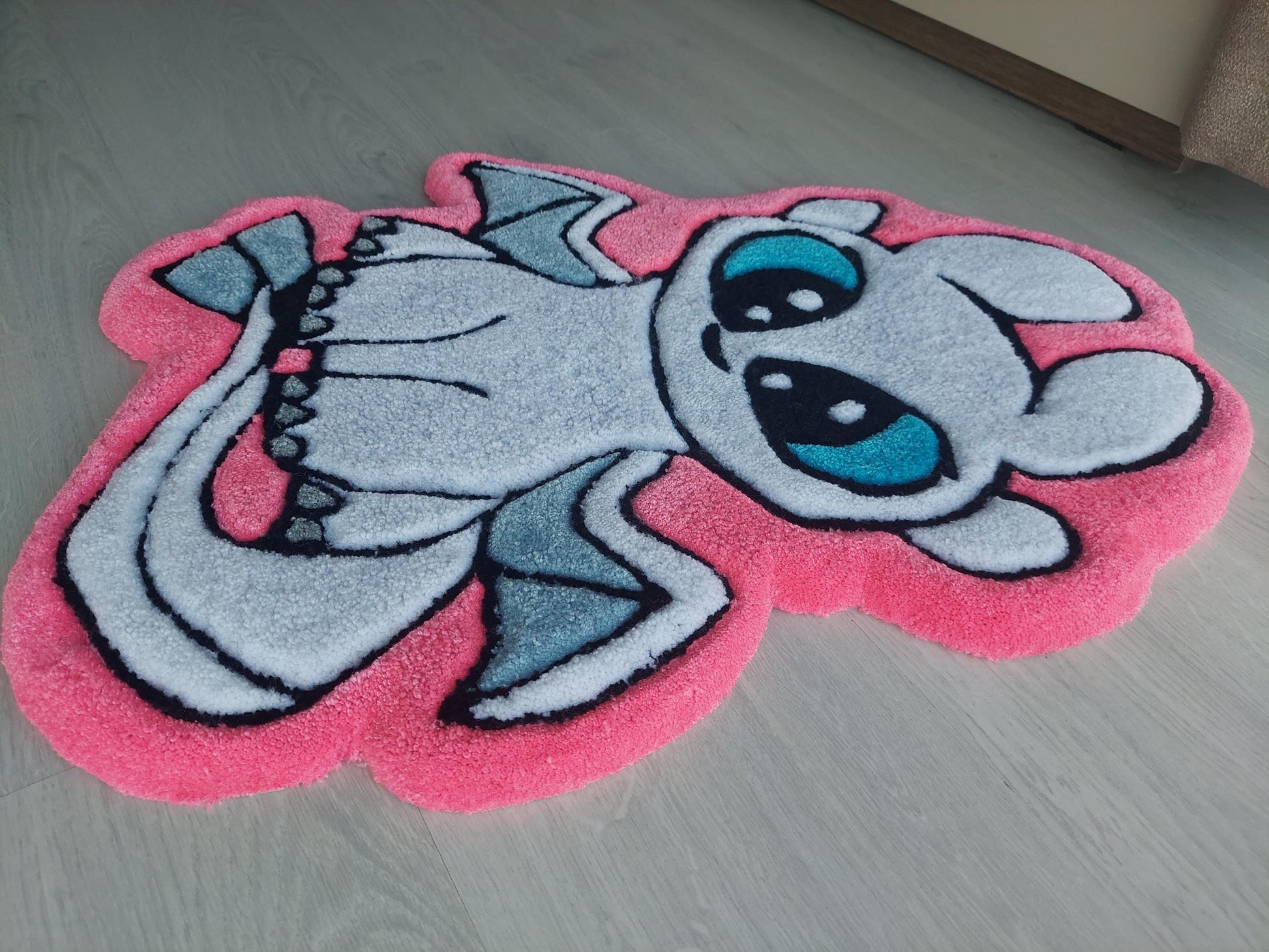 Hand Tufted Dragon Rug for Kids Room – Cute White Cartoon Dragon Mat with Blue Eyes – Soft Tufted Nursery Decor or Gift Idea