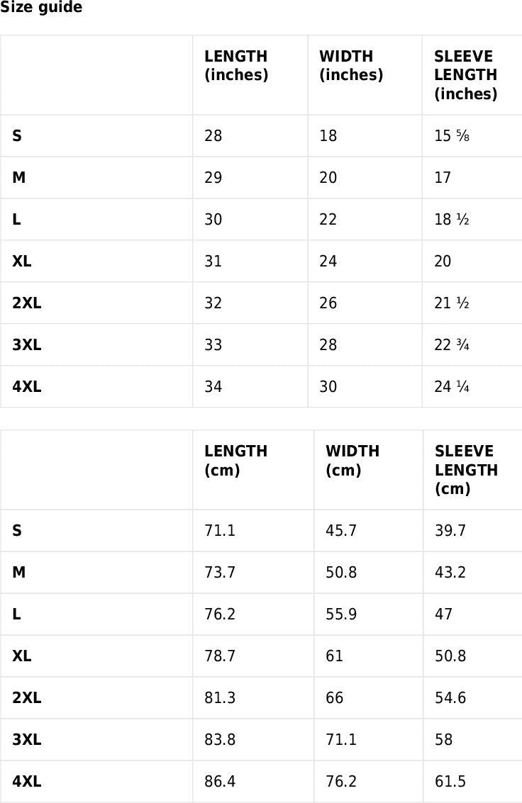 | SIZE | LENGTH (in) | WIDTH (in) | SLEEVE CENTER BACK (in) |