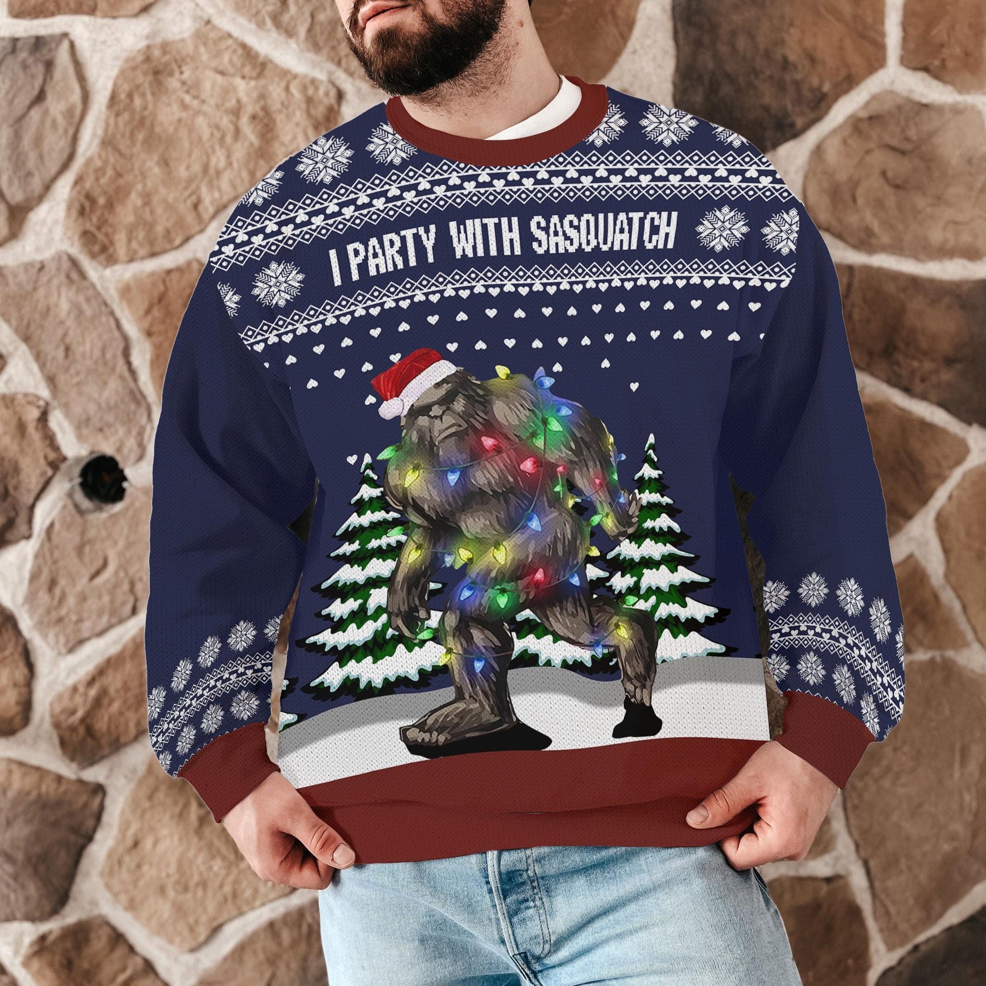 I Party With Sasquatch Ugly Christmas Sweater, Funny Bigfoot Xmas Sweatshirt for Men Women, Holiday Party Outfit Winter Gift Pullover