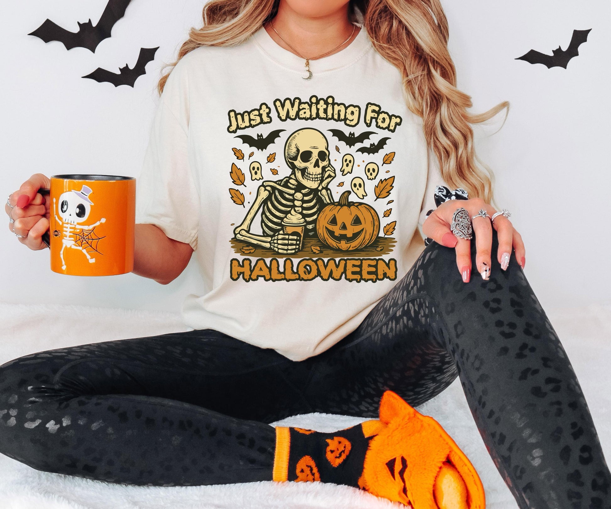Just Waiting for Halloween Shirt, Skeleton Pumpkin Sweatshirt, Halloween Skull T-Shirt, Ghost Skeleton Tee, Spooky Season Gift Hoodie