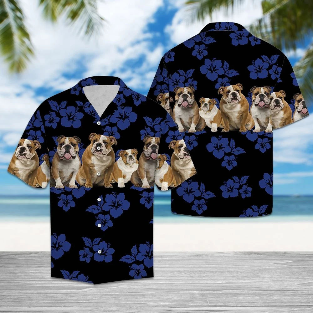 Bulldog Álainn Le Hibiscus Gorm I nDearadh Dubh Léine Haváís, Bronntanas Léine Haváíais, Bronntanas Nollag