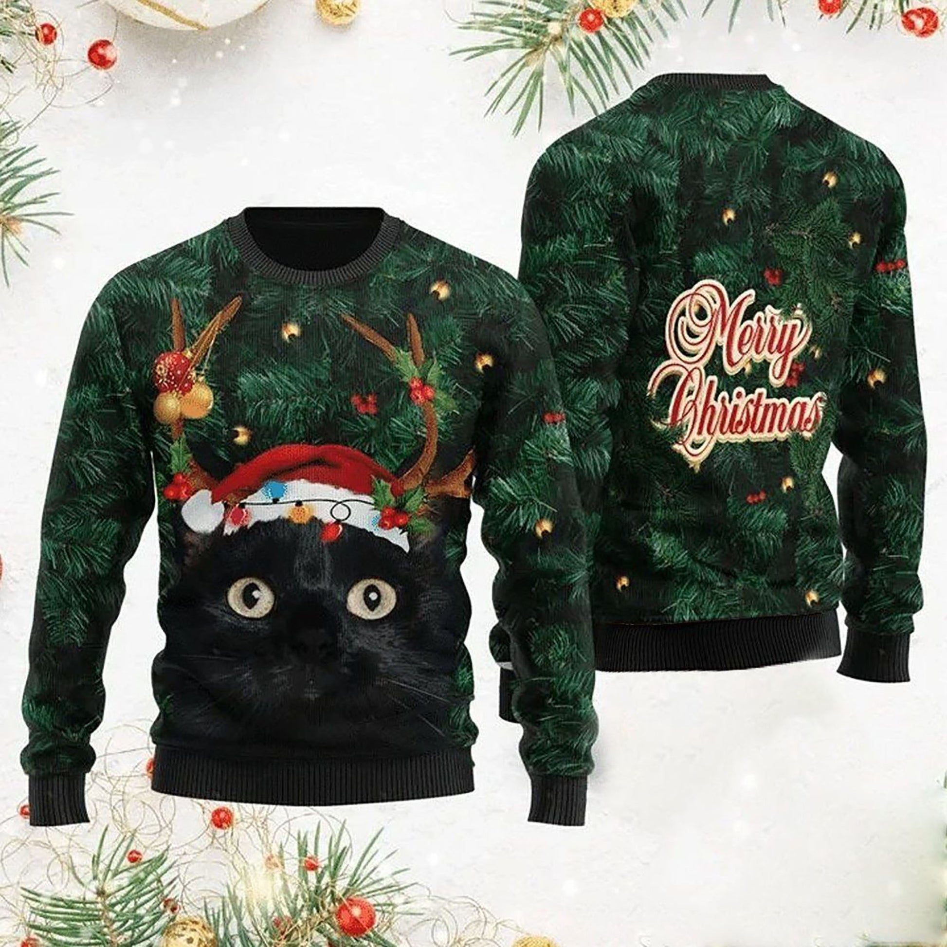 Nollag Shona Cat Dubh sa chrann giúise Geansaí Nollag, geansaí Nollag gránna, bronntanas Nollag, bronntanas Nollag 2024