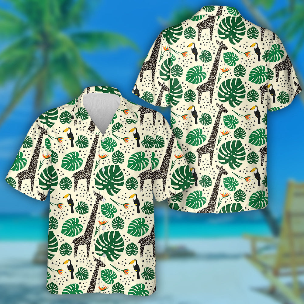 Duilleog Monstera Le Sioráf Dubh Agus Léine Haváí le patrún Toucan, Bronntanas Léine Haváís, Bronntanas Nollag