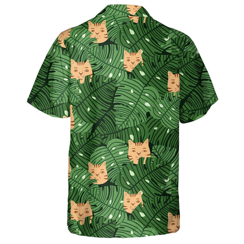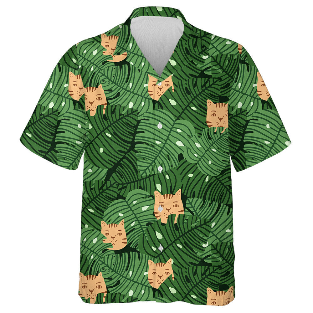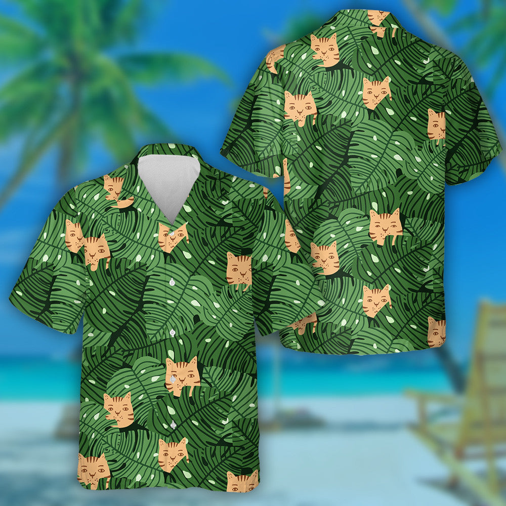 Duilleoga Monstera Agus Aghaidheanna Cait I Léine Haváí Glas Agus Oráiste, Bronntanas Léine Haváís, Bronntanas Nollag