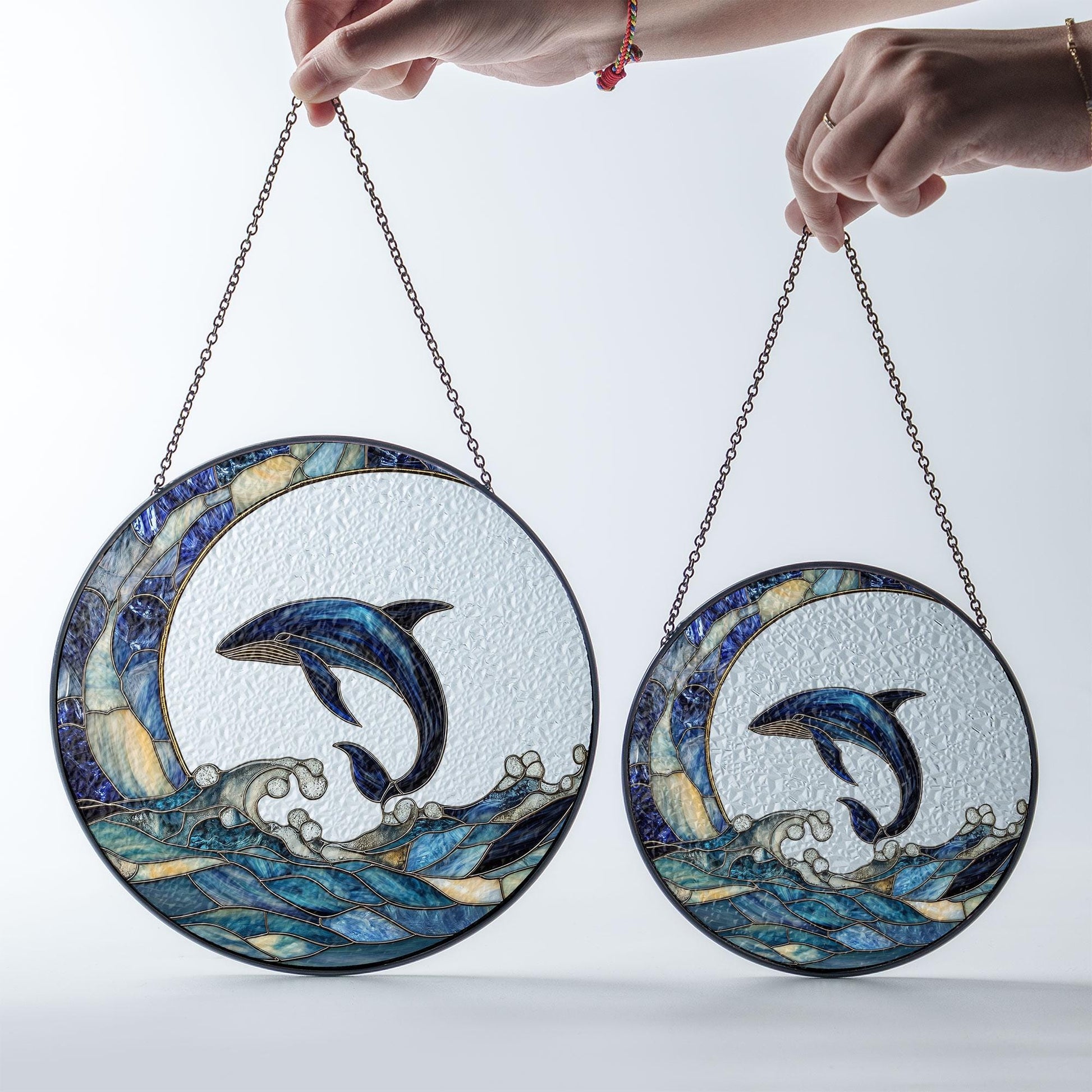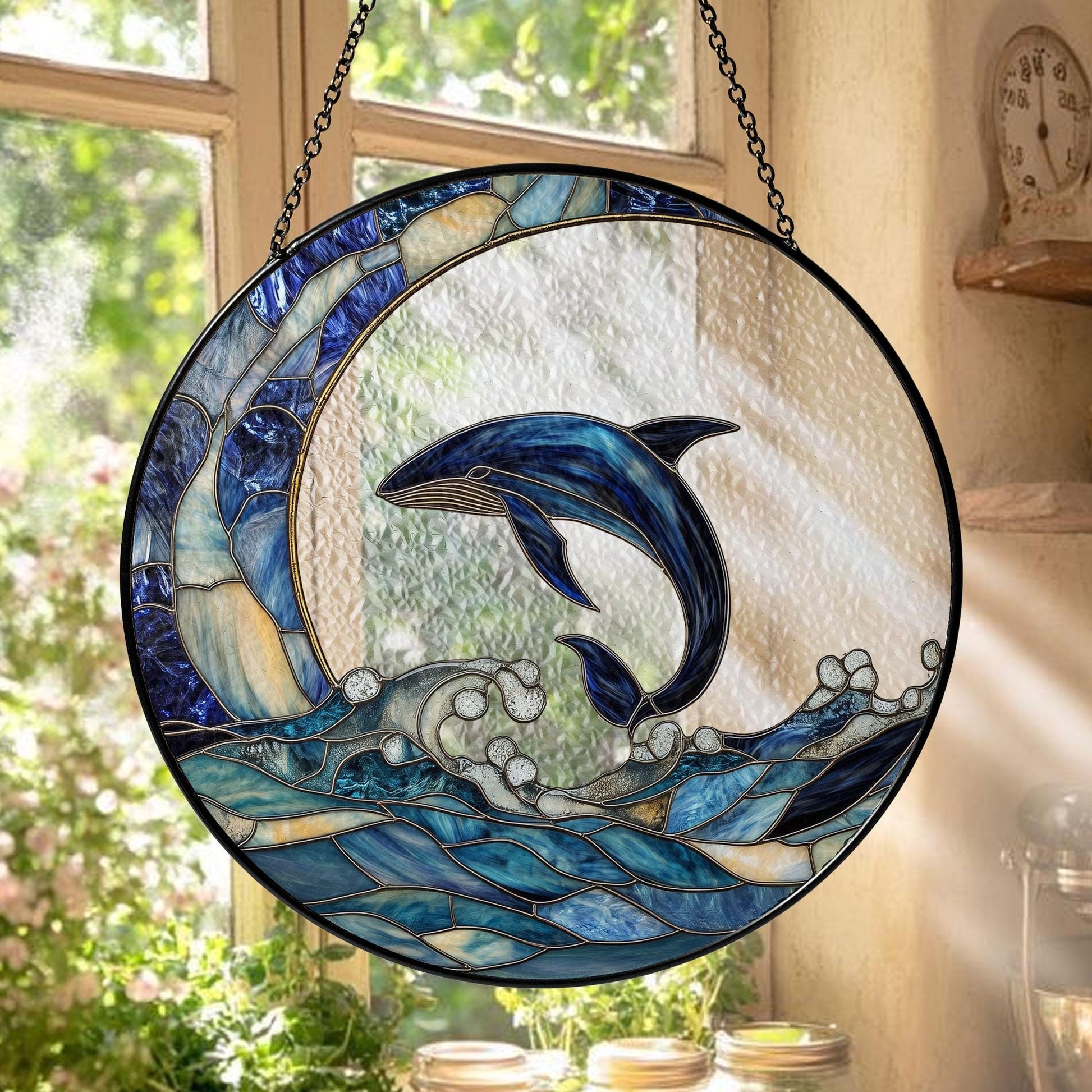 Ocean Dolphin Stained Glass Suncatcher – Blue Dolphin Window Hanging Decoration, Nautical Sea Life Sun Catcher Gift for Beach Lovers