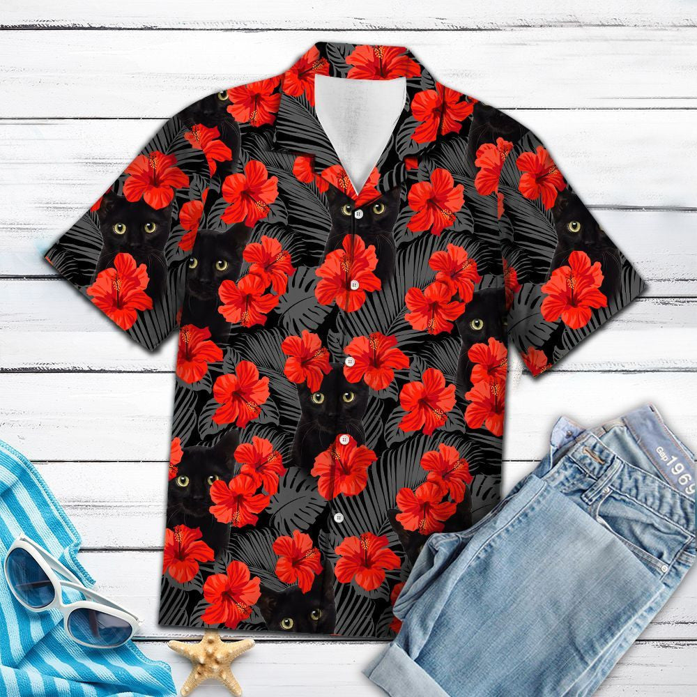 Cat Dubh Peeking Ew Daoine Patrún Hibiscus Dearg Léine Haváís, Bronntanas Léine Haváís, Bronntanas Nollag