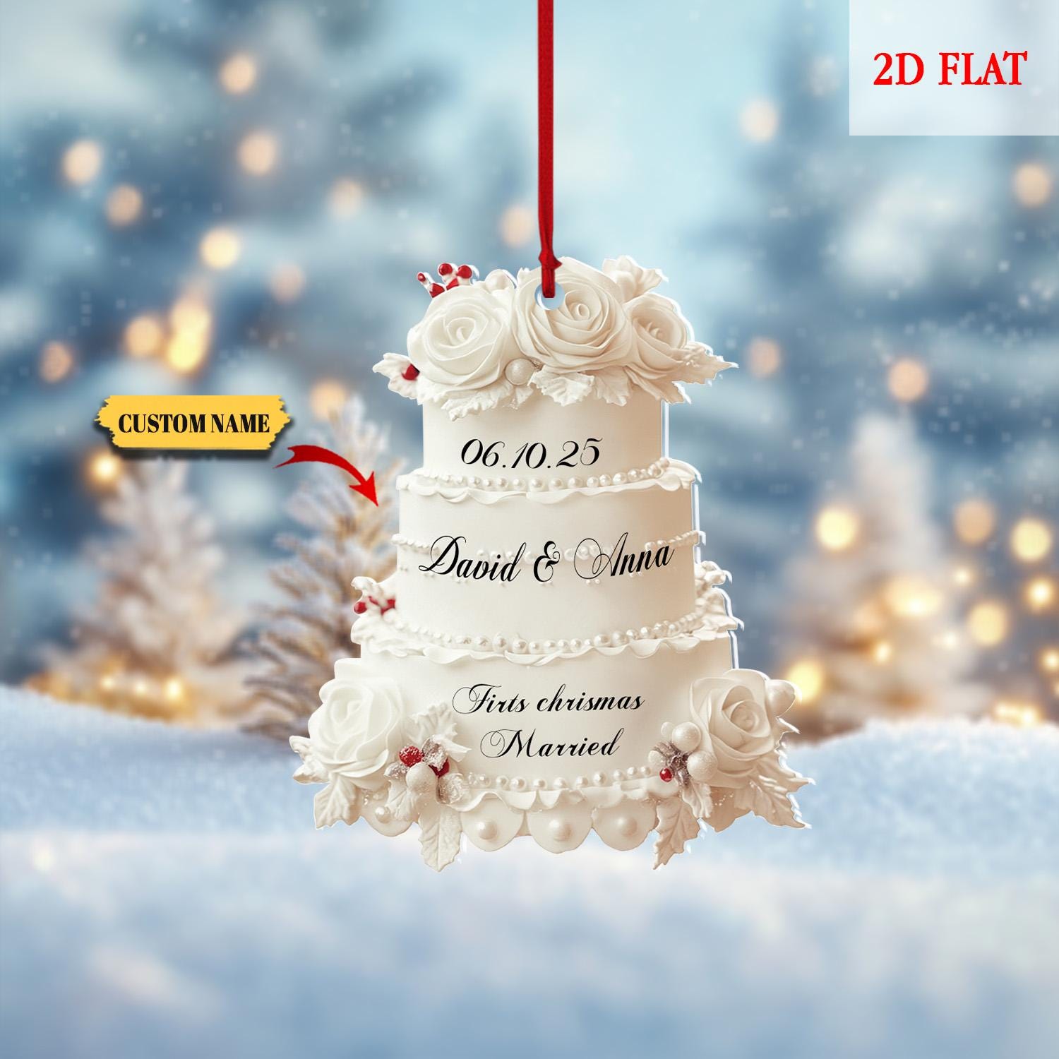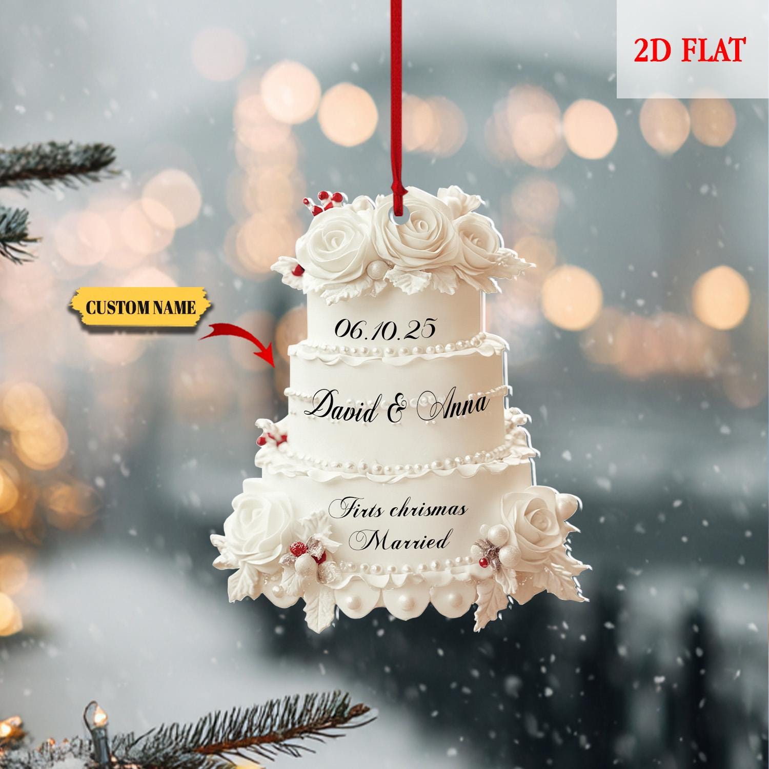 Personalized First Christmas Married Ornament, Wedding Cake 2D Flat Ornament, Custom Name and Date Ornament, Memory, Wedding Ornament