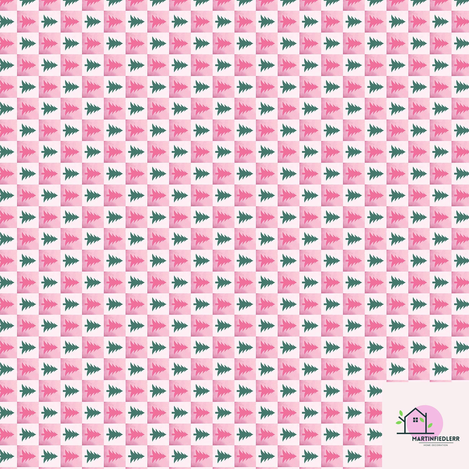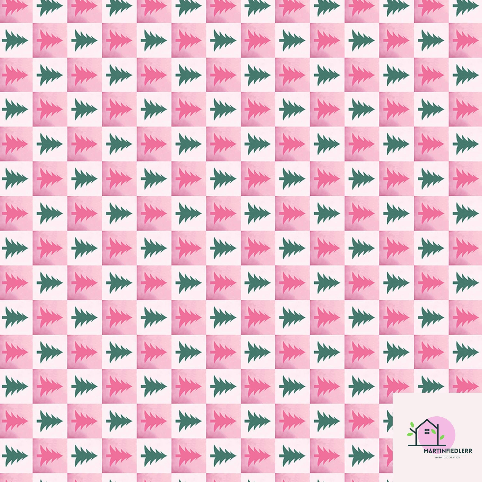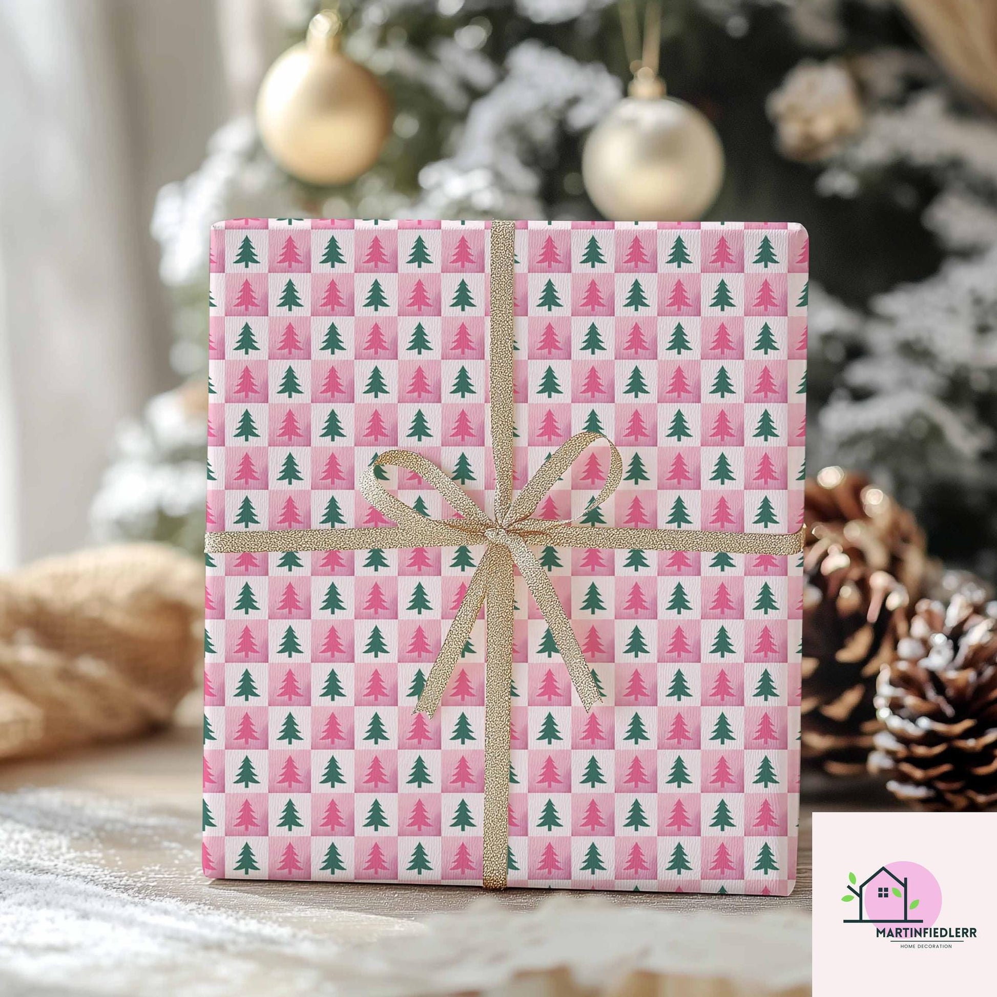 Pink Christmas Tree Wrapping Paper, Modern Holiday Gift Wrap Sheets, Festive Green Pine Pattern Packaging, Playful Winter Party Style