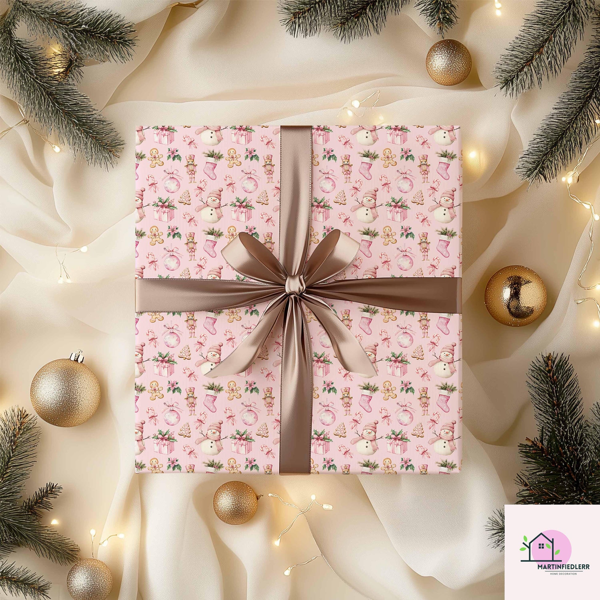 Pink Christmas Wrapping Paper: Snowman & Gingerbread Design