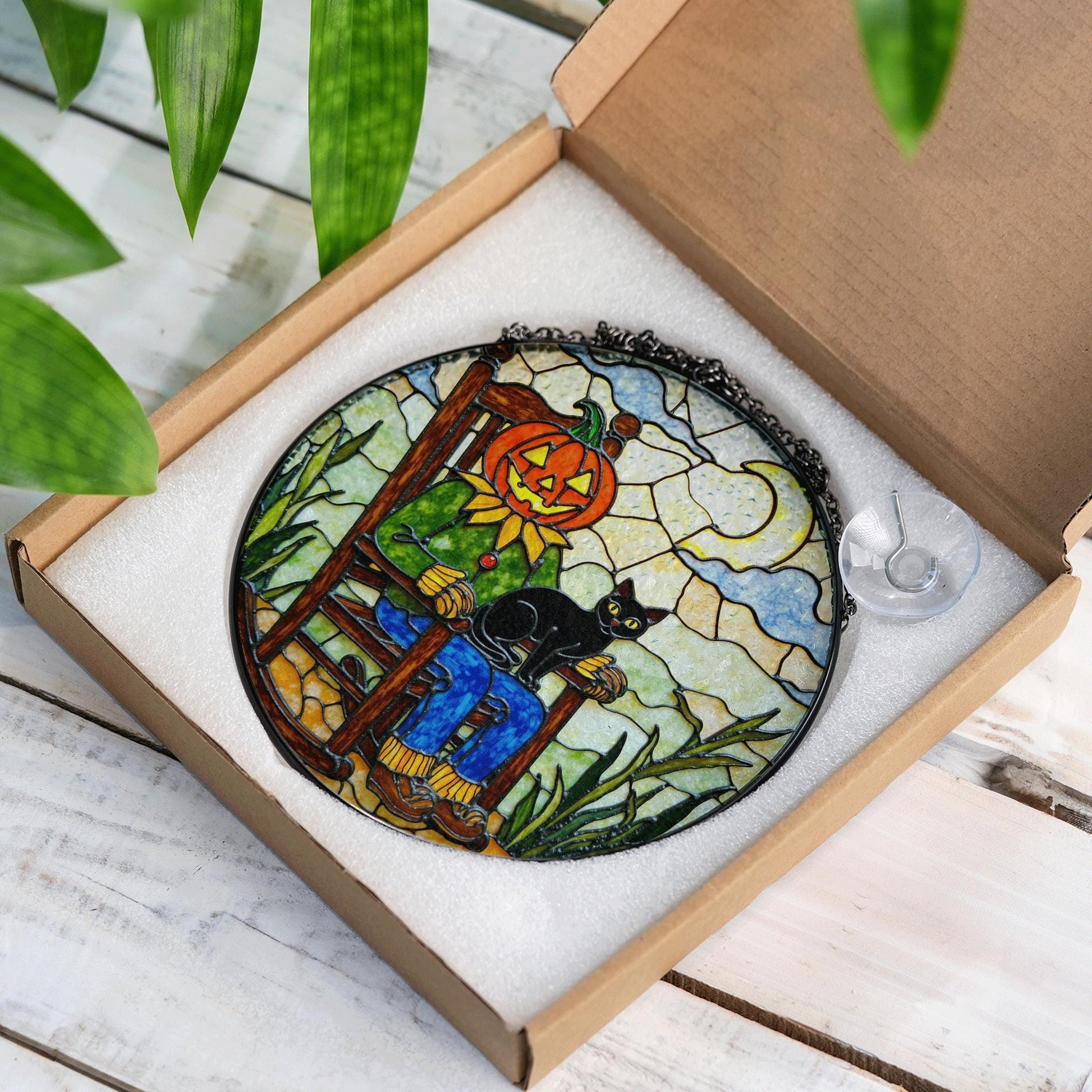 Pumpkin scarecrow with black cat Halloween stained glass suncatcher gift for her or mom